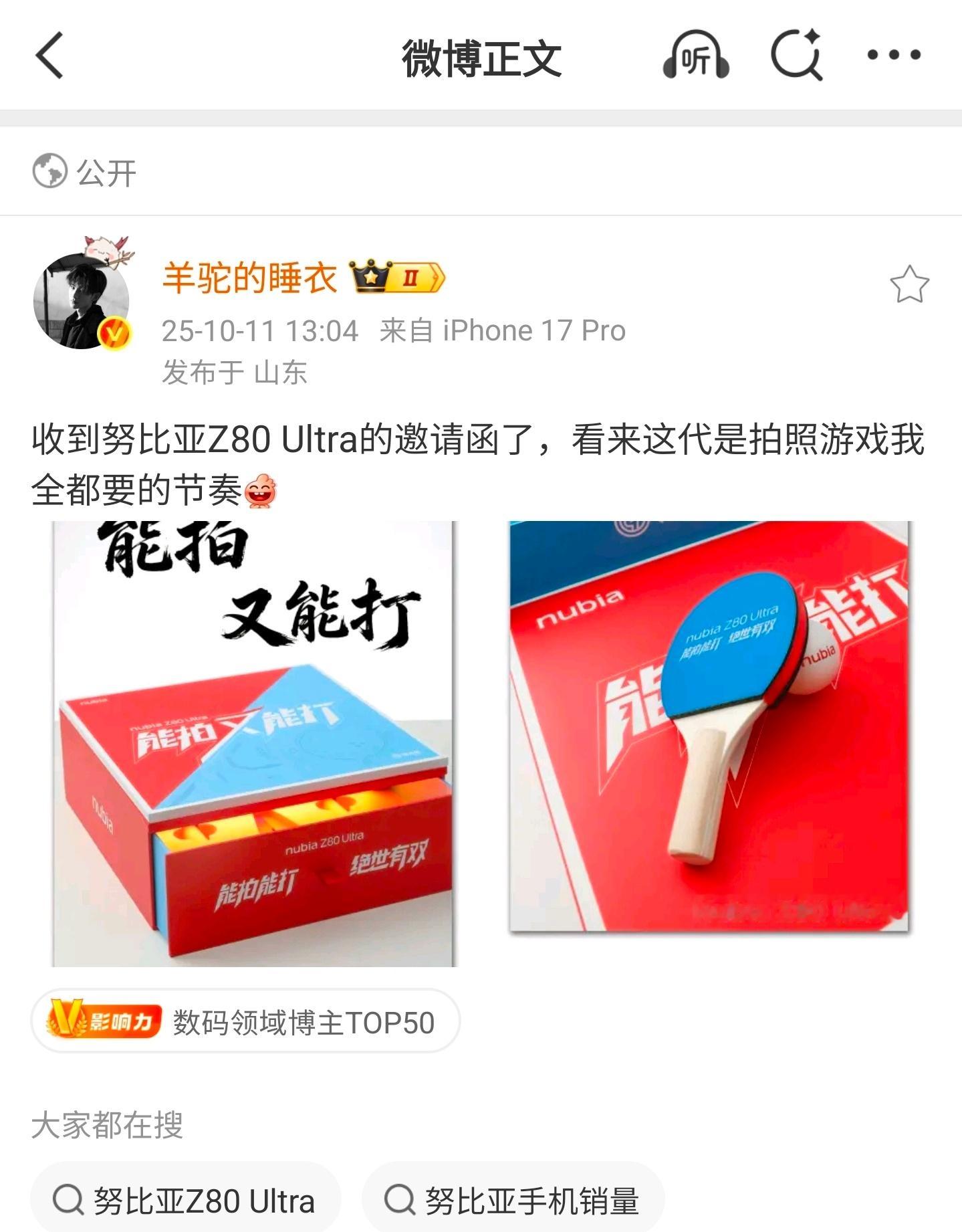 羊驼晒努比亚邀请函博主羊驼晒出努比亚发布会邀请函而不是律师函,可以看得出,努比亚气度非凡,格局起飞,邀请函中了解到努比亚Z80Ultra定档10月22日,据说这次相机猛游戏也很猛,行业新物种,号称街拍游戏机,这就不得不期待下了,你们期待吗?