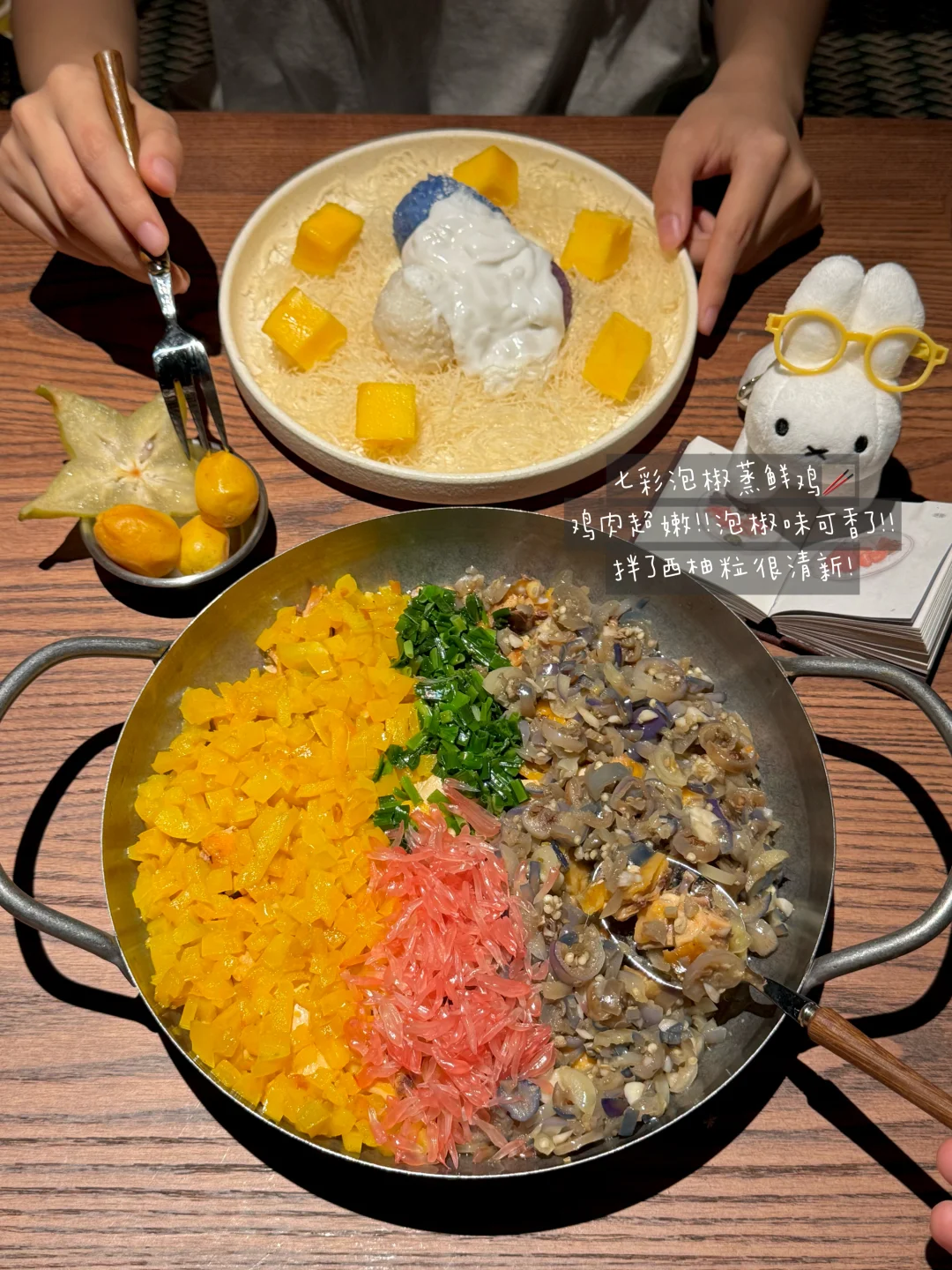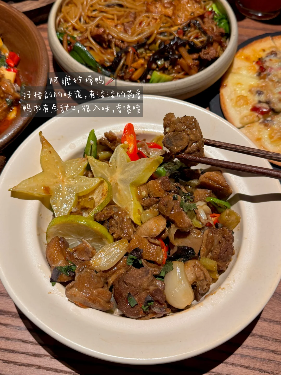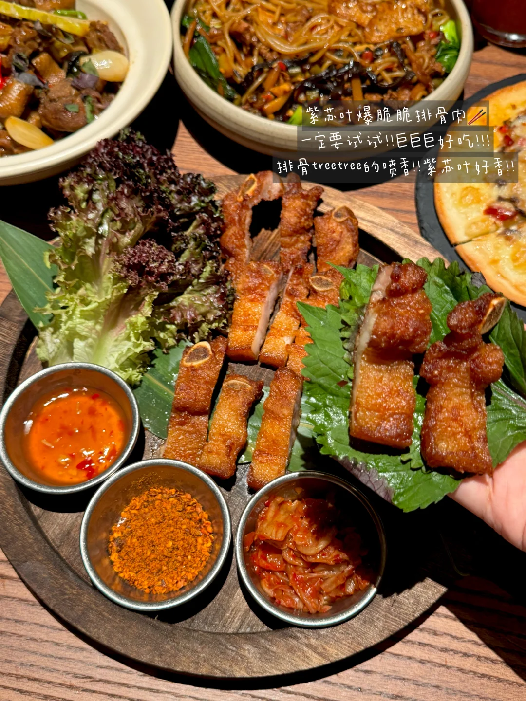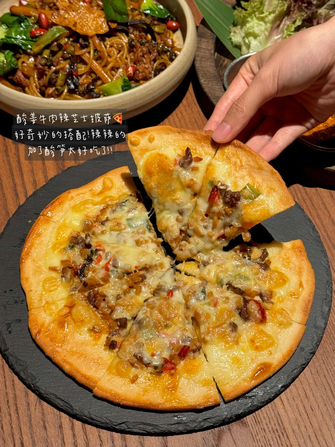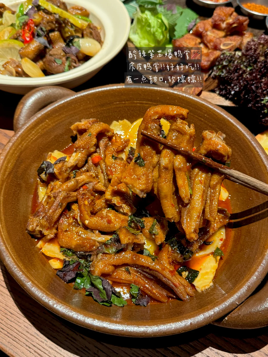 ✔️紫苏叶爆脆脆排骨肉jujuju好吃,七彩泡椒蒸鲜鸡、香酥芋头夹、酸姜牛肉辣芝士披萨、酸辣紫苏爆鸭掌…都是很有特色的菜,酸辣口味很带劲!!搭配广西老盐水,美滋滋!!