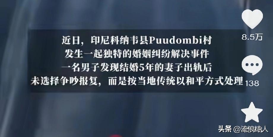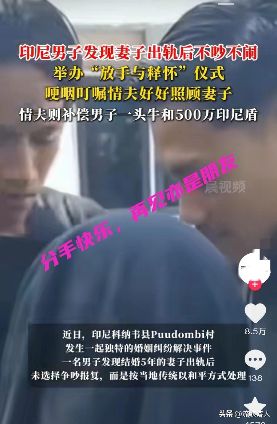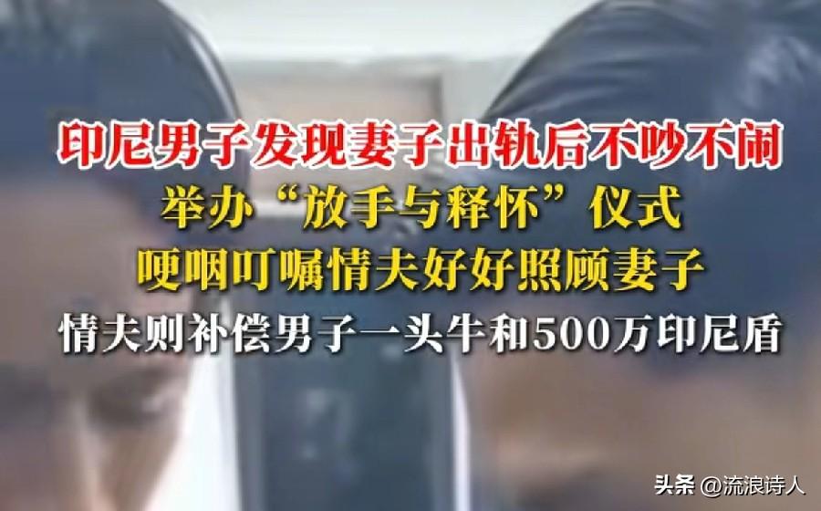 💔发现妻子出轨,他很难过,但却显得很平静,没有争吵,没有责怪,更没有报复。 他约上妻子和情夫坐下来,平静地沟通,确定不爱了,选择放手与释怀。 他担心妻子离开自己后,情夫会对她不好,他千叮咛万嘱咐情夫:“好好爱她,好好照顾她”。😭 情夫为表歉意,也赔偿了他一头牛和500万印尼盾(约合2155元人民币)。 以上是印尼的一个小伙,发现与自己结婚5年的妻子出轨后的做法。 我想,他不是不爱她了,也不是不难过,只是觉得对方不爱了,那就放手让她去追寻自己的爱,也许这是他对她的最后一次疼爱! 也有一种说法,这种分手方式,是印尼当地处理婚姻纠纷的传统方式。分手会举行“放手与释怀”的仪式,仪式上,会相互平静地坐下来沟通,最后进行责任交接。 有网友觉得这种分手方式的风俗显得对待感情太过于不重视,太草率。 但也有网友觉得这是最好的分手方式,毕竟既然不爱了,就好聚好散,别再互相折磨与埋怨。 你怎么看??? (消息来源:潇湘晨报)