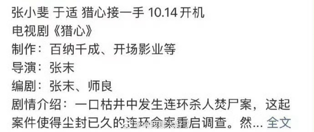 网传张小斐、于适的猎心10.14开机,大家看好这部剧吗?​​​