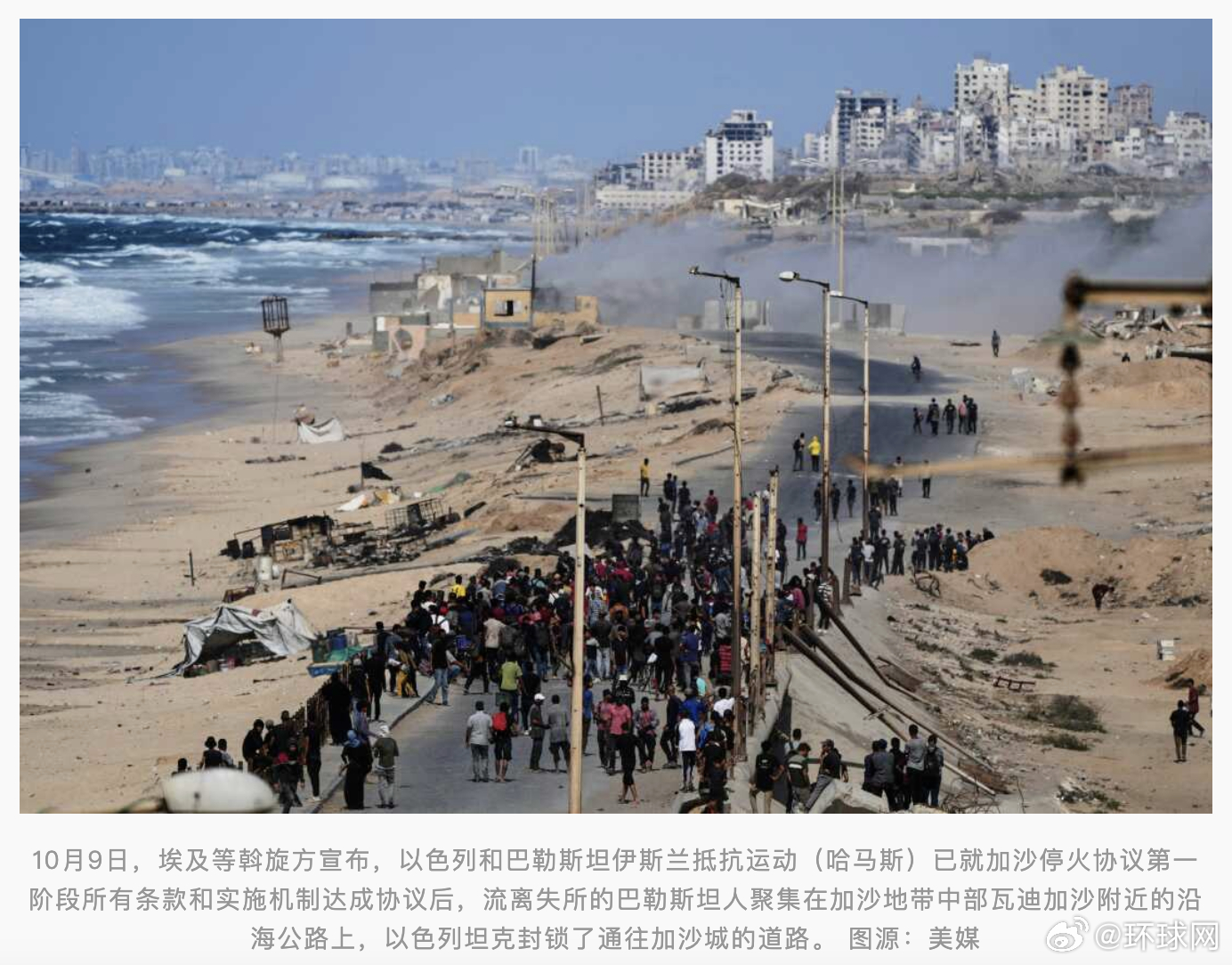 据埃及开罗新闻电视台9日凌晨报道,埃及、卡塔尔等斡旋方宣布,以色列和巴勒斯坦伊斯兰抵抗运动(哈马斯)已就加沙停火协议第一阶段所有条款和实施机制达成协议。以色列国防军10日发表声明说,加沙停火第一阶段协议已于当地时间10日12时(北京时间17时)生效。