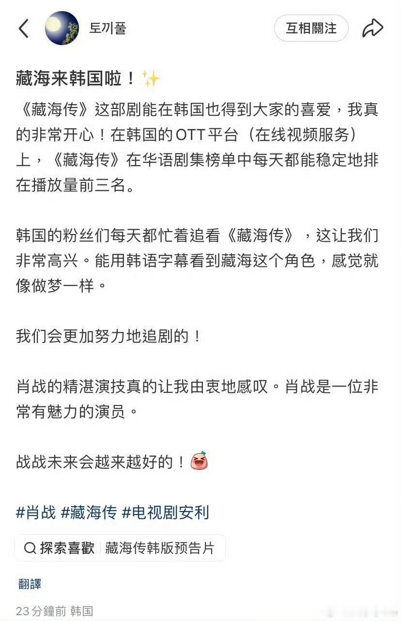 《藏海传》在韩国平台的华语剧集榜单中每天都能稳定地排在播放量前三名,这波文化输出[馋嘴][馋嘴][馋嘴]