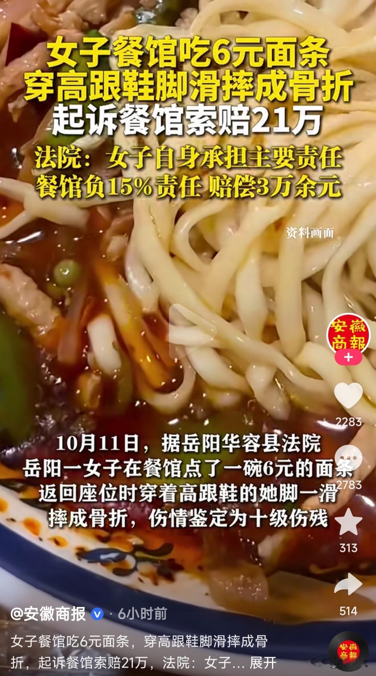 岳阳一女子在餐馆点了一碗6元的面条,返回座位时穿着高跟鞋脚滑摔成骨折,女子起诉餐馆索赔21万元。 这女子如果在室外马路上滑倒摔骨折了她应该去告谁来赔偿?她在餐馆点了一碗6元的面条,由于自己穿着高跟鞋滑倒摔骨折了,她居然起诉餐馆老板赔偿21万,这给人的感觉咋有点像在讹人呢?她光起诉餐馆老板不应该啊?她应该起诉装修工铺地板的,还有制造地板的,在把高跟鞋厂家也起诉了,这样不是赔偿的更多吗?如此赔偿下来后半辈子就算是躺在床上吃喝拉撒都衣食无忧了不是吗? 这老板简直比窦娥还冤,卖了一碗6元的面条顾客还没吃到嘴里,竟然给人家赔偿了3万多,这3万多不知道要卖多少碗面条才能赚回来?万幸的是她滑倒摔骨折了,这万一滑倒突然之间摔死了,这不知道又要赔偿多少个3万?餐厅摔伤 饭店摔伤