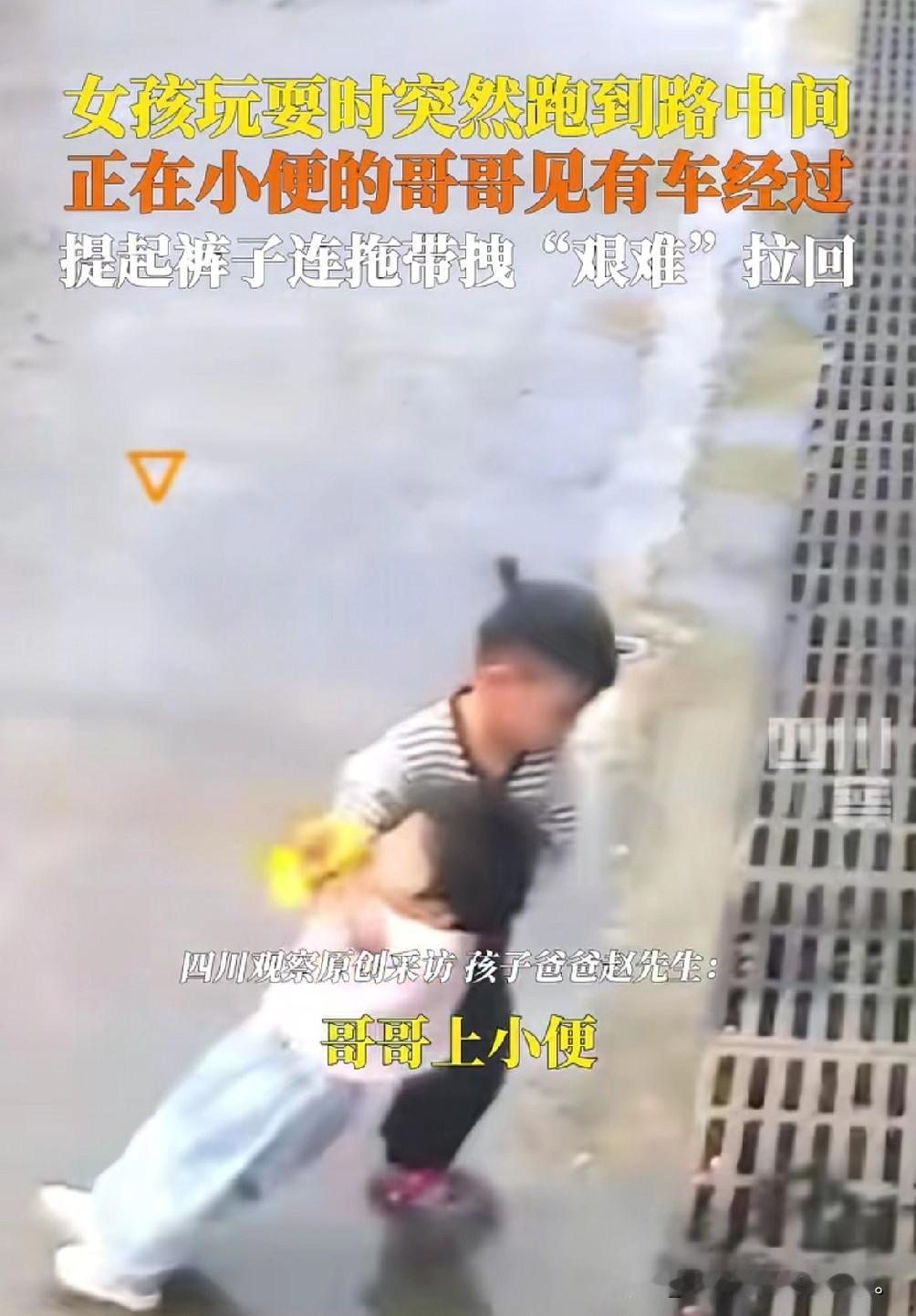 有哥哥的人就是幸福, 关键时刻有事哥哥真上, 安徽淮北有一对兄妹,哥哥三岁,妹妹一岁半,在自己家门口玩耍。 妹妹刚会走路还走不太稳,妹妹想去对面玩,刚到马路上身上突然有个东西掉下了,吸引妹妹的主意,妹妹就站在路上发呆动也不动。 这时候三岁的哥哥就站在一边尿尿,哥哥时刻在注意妹妹的动向,发现妹妹的东西掉了哥哥没着急去捡,等哥哥发现有车子过来,哥哥尿也不尿了,直接提起裤子,一把薅过妹妹,拉着就往路边跑! 等车子过去,哥哥正好把妹妹拉倒了安全区域,这时候车子刚开过来,哥哥把握时机真的准! 别的不说就哥哥这个随时停尿的本事确实牛,既把住了年,又把住了妹妹,司机也许会停车,但是在哥哥的意识里妹妹站在路上随时会有危险。 这就是血脉相连的力量,以后谁还说他还是个孩子不懂事,就应该给他看看这段视频,三岁的孩子都知道车子过来了应该躲避,怎么会不知道什么事情是危险的!