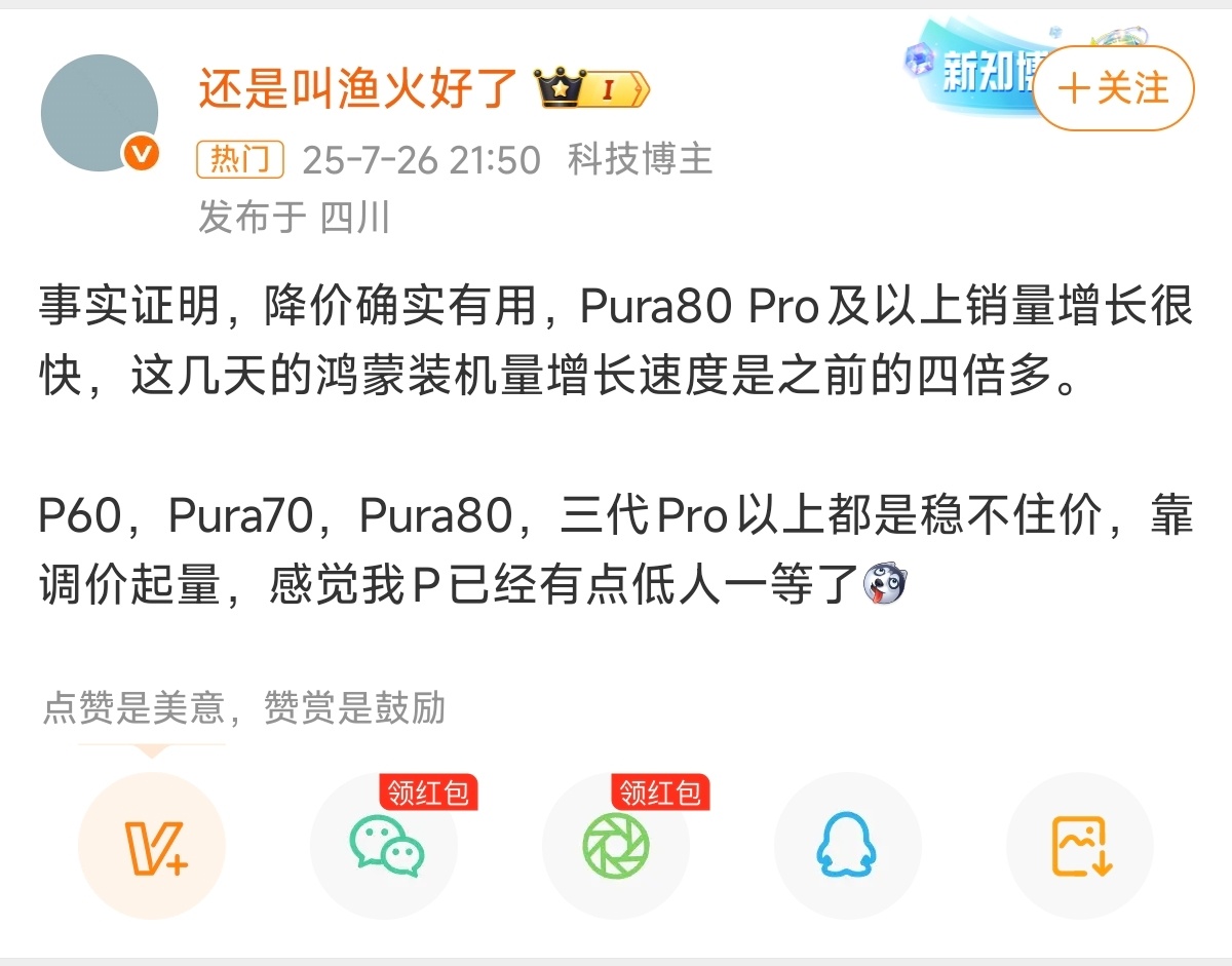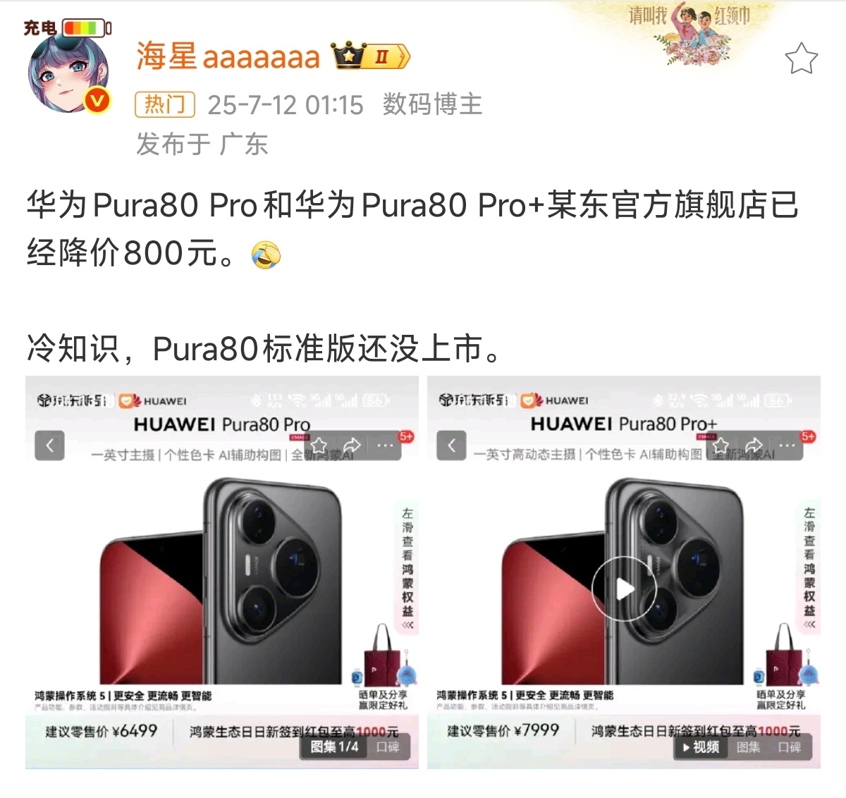 发布不到一个月,标准版还没上市,7月份Pro系列直接降价800,后面又“感恩大回馈”,Ultra 最高优惠1500。当时他们说的是,“销量增长很快,标准版不缺销量,鸿蒙激活量水涨船高”。