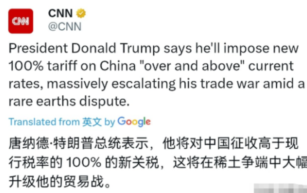特朗普恼羞成怒,扬言要对我们征收100%的关税!在我们进行严格的稀土管制政策之后,特朗普放话声称,将从 11 月 1 日起对中国征收 100% 的关税,高于其目前支付的任何关税。甚至一些不是中国制造的产品也将实施大规模出口管制。中国的做法,这影响到所有国家,无一例外,而且显然是他们多年前就制定的计划。 特朗普这招,纯属搬起石头砸自己的脚,中国刚宣布稀土管制,他就跳脚要加征100%关税,还把黑手伸到非中国产品上。这种"我能制裁你,你不能反制我"的强盗逻辑,连美国企业都看不下去了。 先说说美国的稀土困局,美国国防部报告承认,他们70%的稀土依赖中国进口,F-35战斗机的电子元件、爱国者导弹的制导系统,都得用中国稀土。 中国这次管制直接卡死供应链:任何含0.1%中国稀土的外国产品出口,都得找中国审批。 结果美国军工企业库存告急,洛克希德·马丁的F-35生产线被迫停工,五角大楼急得追加50亿美元建本土提炼厂,但专家说没十年根本搞不定。 特朗普的关税威胁更离谱,他声称11月1日起对中国商品加征100%关税,还想扩大出口管制范围。 但美国商务部的数据打了他的脸:2025年前三季度,美国从中国进口额同比增长12%,服装、电子产品等民生商品占比超60%。如果真加征关税,美国超市物价至少涨40%,普通家庭每月得多花300美元。 更搞笑的是,美国农民已经因为关税损失450亿美元,中西部农业州的共和党议员联名警告特朗普:再这么折腾,2026年中期选举别想保住席位。 中国的反制措施精准有力,除了稀土管制,中国还对美国船舶征收对等停泊费,对高通展开反垄断调查。高通每年在中国赚200亿美元专利费,这次调查直接让其股价暴跌18%。 更绝的是,中国推出"稀土技术出口管制",把开采、冶炼、磁材制造全链条纳入管控。美国德州的稀土分离厂折腾了五年,至今连环保审批都没过;澳大利亚的Lynas公司拿了美国国防部1.2亿美元,结果发现没中国技术根本开不了工。 而美国国内反对声浪一浪高过一浪,特朗普的关税政策导致美股三天内蒸发2万亿美元市值,纳斯达克指数创下2020年以来最大单周跌幅。美国商会公开批评:"这种自杀式政策正在摧毁美国制造业"。更讽刺的是美国政府停摆已经持续10天,连负责贸易谈判的官员都被裁掉一半,特朗普想谈都找不到人。 历史教训早就摆在眼前。1930年美国通过《斯穆特-霍利关税法》,把2万多种商品关税提高到60%,结果引发全球贸易战,美国进出口额暴跌67%,失业率飙升至25%。如今特朗普重蹈覆辙,欧盟已经宣布将对美国汽车征收100%报复性关税,日本、韩国也在酝酿反制措施。美国智库CSIS警告:"如果贸易战全面爆发,2026年美国GDP可能损失1.2万亿美元"。 说到底,特朗普的关税大棒就是纸老虎。中国有14亿人口的超级市场,有全球最完整的工业体系,还有"一带一路"朋友圈的强力支撑。美国想靠制裁压垮中国,简直是白日做梦。特朗普要是继续执迷不悟,最终只能成为美国历史上最大的贸易输家。 来源:新浪财经 【特朗普宣布将对中国商品加征 100% 关税并实施出口管制】