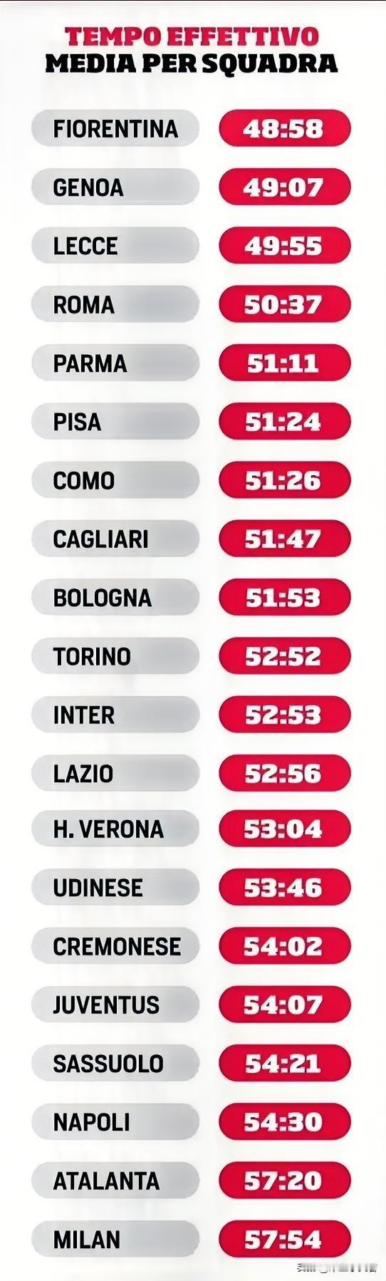 米兰第一!意甲联赛迄今为止比赛有效时长排名第一的为AC米兰。我们好久好久没有在这个榜单名列榜首了,别说榜首我们好久都没进过前三了。 比赛有限时长这个东东其实就是比赛的观赏性,我们可以理解为有效时长越多,比赛观赏性越强,我不清楚各位老哥的看法,我个人感觉比赛确实不像原来那样支离破碎了,但观赏性这个事情有待商榷,我看着我们的比赛总是不能提起精神,感觉有点昏昏沉沉的。当然咱们前面几场比赛,都是两点四十五,有可能这个时间是自己熬不住,但如果比赛真的精彩,也不至于那么想睡觉。 只能说官方的解释不那么清晰,我部门小哥哥说NBA的有效时长统计基础是有球运转效率,个人觉得小哥哥解释应该更正确,毕竟我的感受是有效时长与比赛精彩不是一个意思,我们有效时长确实长了,比很多英超球队都长,但比赛精彩承诺还是英超好看,我十一长假期间看了好几场英超录像,比赛打的确实精彩。