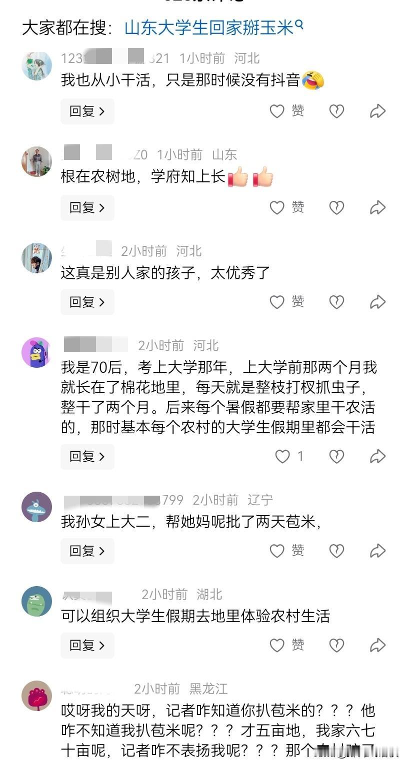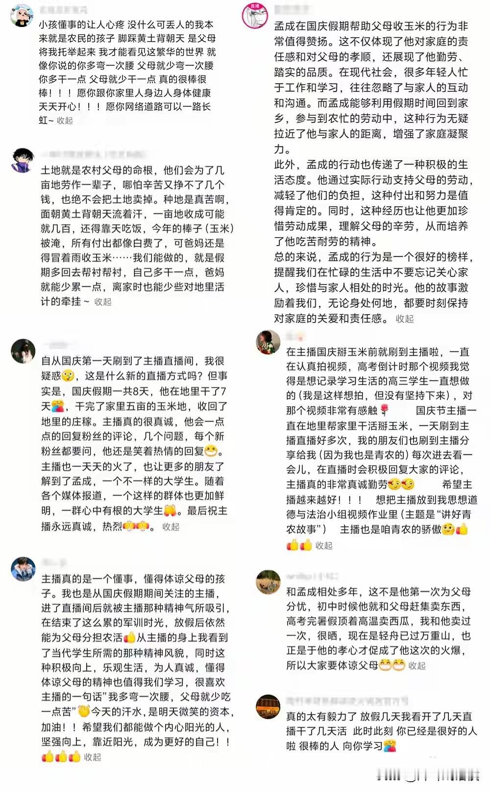 为何“在老家掰了7天半的玉米”,这大学生就因此火了? 连人民日报都给他点赞! 原来,在这个国庆8天的假期里,青岛农业大学的新生孟成,把这个他今年的国庆节安排的明明白白,他用自己的故事感动了无数网友。 别人看有8天假期,很多选择出去旅游,孟成他却选择回家干农活掰玉米,8天有7天半在田里,还有半天坐上了去学校的列车。 到底发生了什么?难道他喜欢干农活? 倒不是因为他们家没人,而是因为体恤父母。 国庆节期间,父母要趁这个假期出去卖水果,增加家里的收入,家里的玉米就没人收,碰巧十一之前的连雨天气,地里太泥泞了,收割机也没法下地。 所以,要么就等地干一些,要么就只能靠纯人工去收,用孟成的话说“自己多干一点的,父母就少操劳一些。” 他有一个同学,听到他在家掰玉米也过来一起帮忙。 孟成父亲接受了采访,孩子整天在地里干农活,做父母的既欣慰又放心,老两口就一心一意在街上卖水果了,最多收了摊去地里帮忙。 而孟成的故事,之所以会被人民日报点赞,是因为孟成把自己在家掰玉米拍成了视频发到网上。 就是想告诉其他人,国庆并不只有外出旅游一个选项,也可以承担起家庭的责任。 的确,他是个有孝心的好孩子!