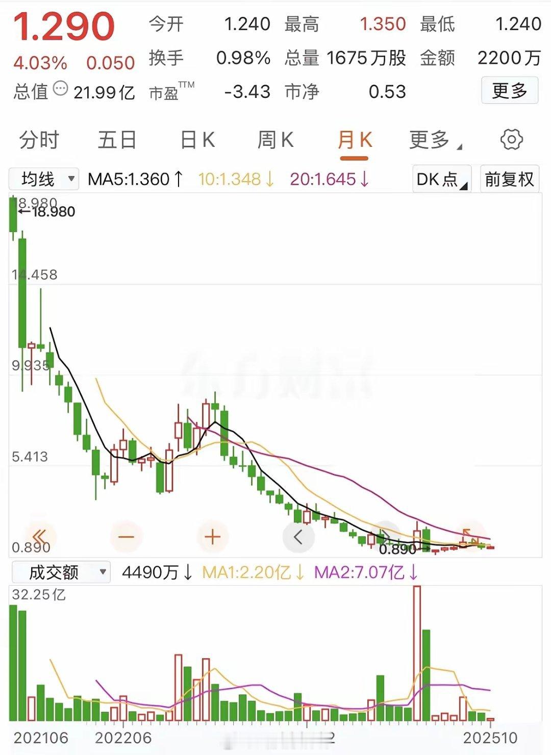 这只奶茶股不知道啥原因跌的这么凶?一网友以18元买入了10000股试试水,没想到买在了最高点,此后股价开始阴跌,跌至半山腰略有反弹,很多人以为企稳了,其实那是中场休息,此后又一根实体大阴线,其中有一段竟然连跌10个月,也是离谱!股价最差时跌破1元,该网友最大亏损—95.05%,18万本金仅剩下8900元,他死马当活马医继续拿着,祈祷能够回本,最近股价涨到了1.29元,但还是被10日均线压制,你觉得等待几年能回本?
