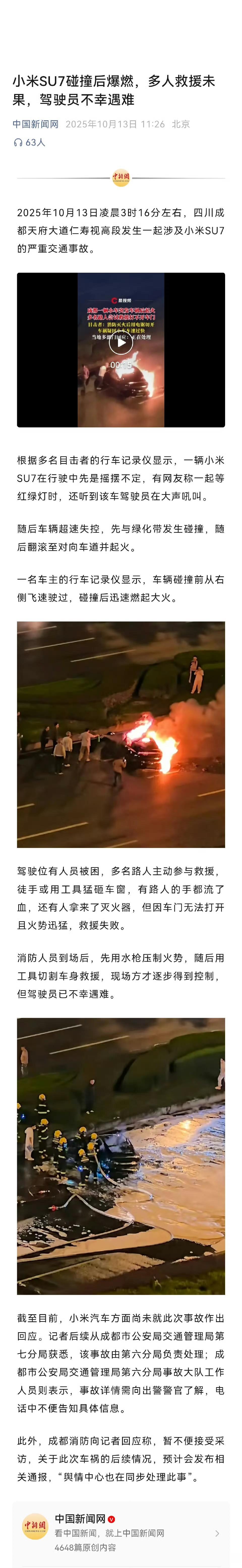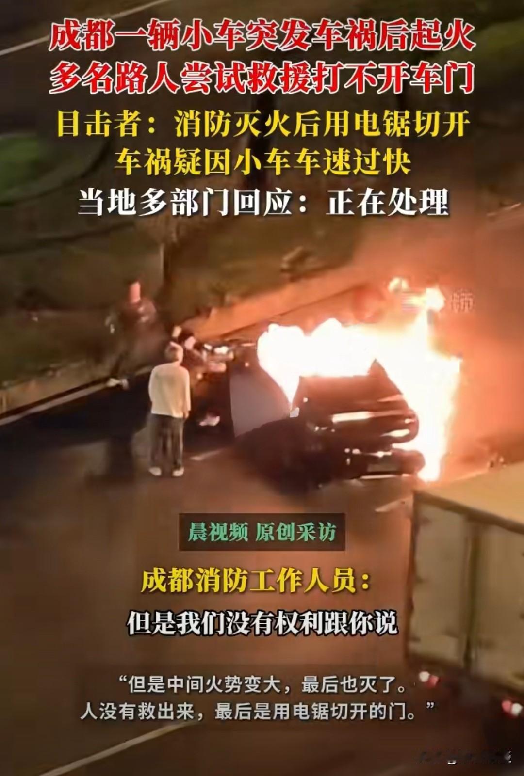 一上午刷了好多视频,成都天府大道一新能源车超速行驶,失控撞击翻滚,而后起火。不过车主却未被救回,虽然现场多人已经尽力了! 从网传视频和评论看出,这起车祸伤亡可能不得不让人关注以下几点 1、超速行驶,150以上的速度失控起来几乎不会有生还的可能 2、车门把手为啥打不开,虽然周围人都已尽力,但却以门打不开而只能“袖手旁观”,就连消防员也只能最后把门锯开,但很明显为时已晚。 3、车主可能存在酒驾的行为,如果真如评论区网友所说,喝完酒走路都不稳,却尝试着去开车,无非是以身试险。 不过此事到底原因是啥,我们拭目以待,是不是仅有车主自身的原因?