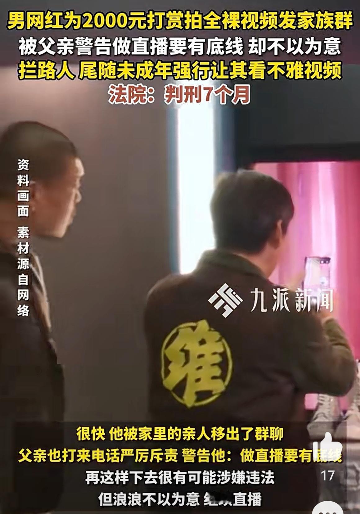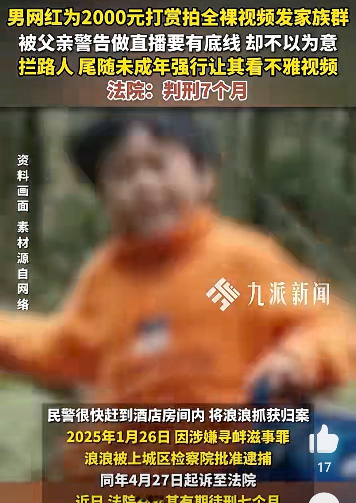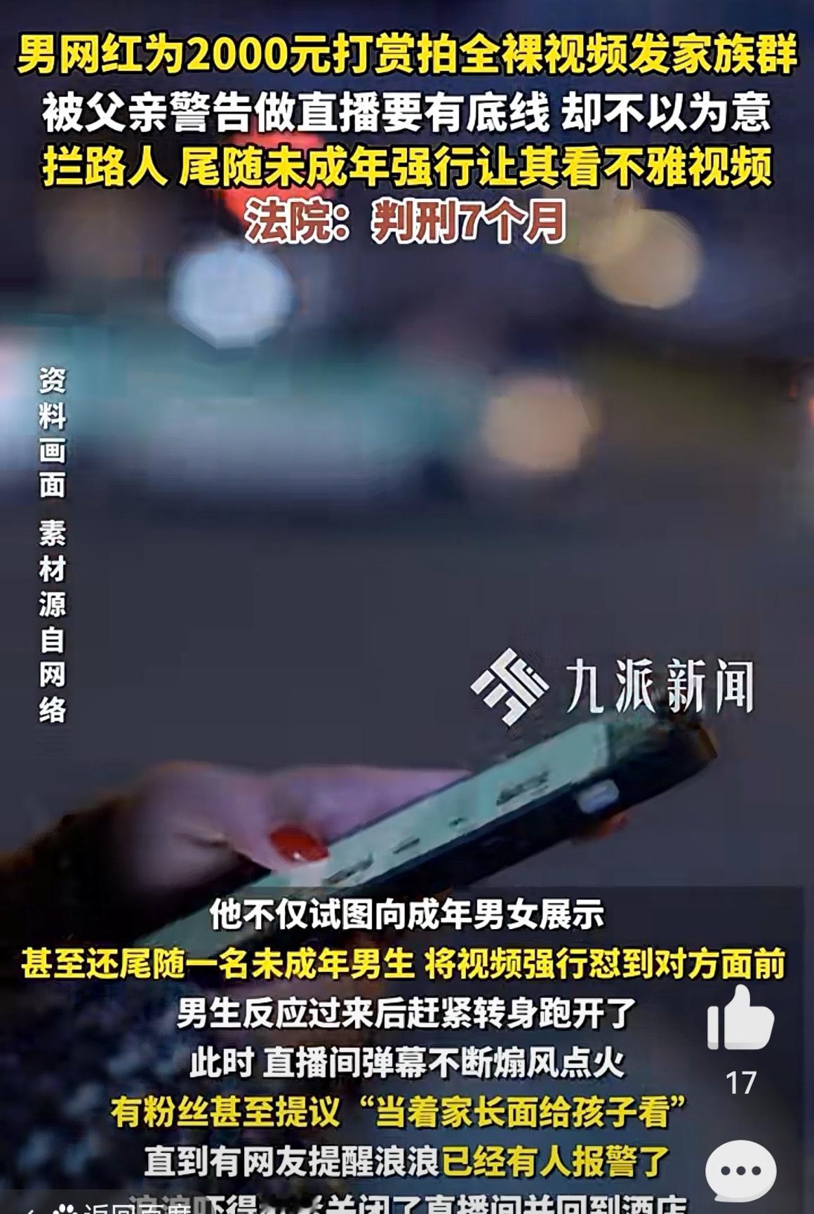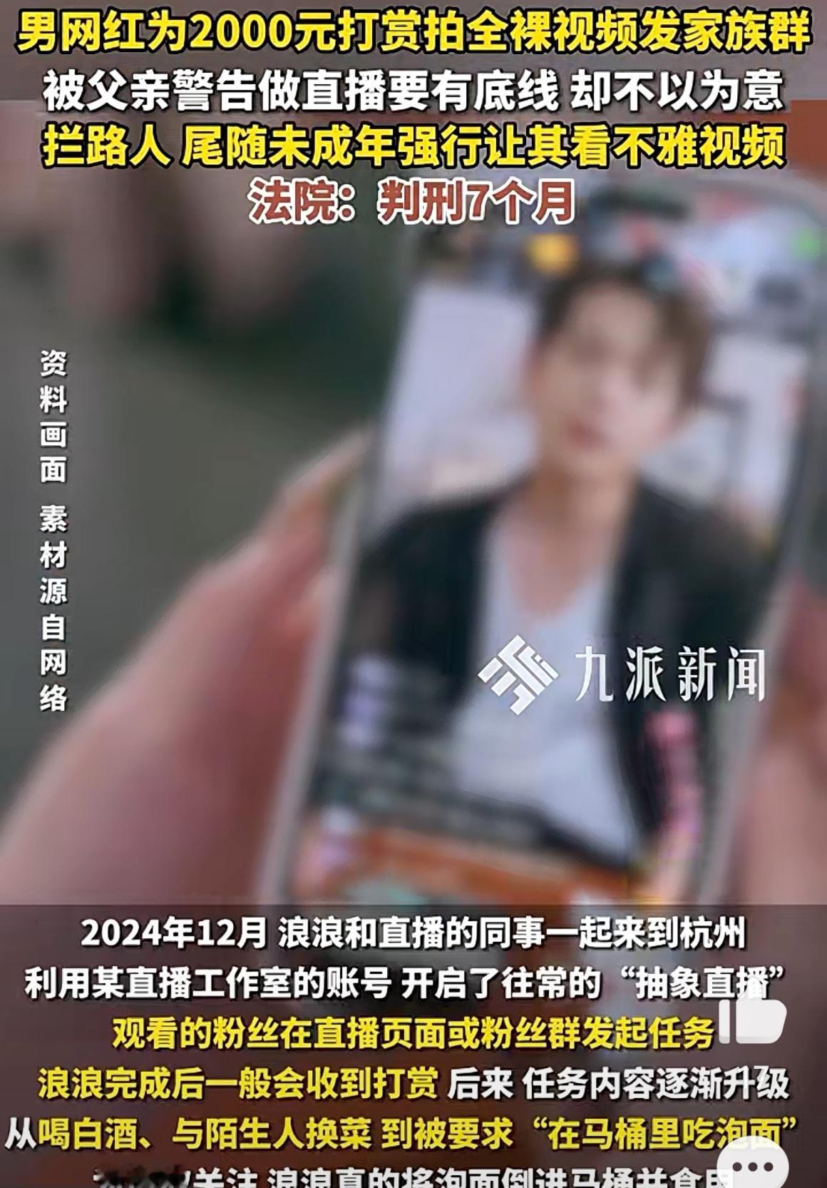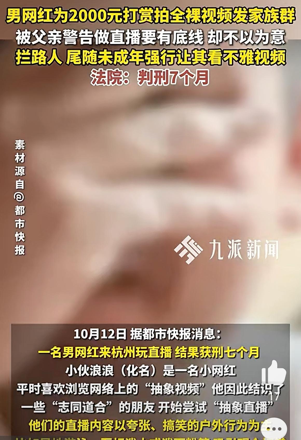 为打赏在西湖边强塞不雅视频、尾随未成年人——这网红把"没底线"玩成了犯罪,7个月牢饭一点不冤! 浪浪的堕落,是流量狂欢里的一个极端标本:粉丝让吃马桶泡面就吃,给2000块就发裸照到家族群,亲爹的警告成了耳旁风。他以为"抽象直播"的边界是博眼球,却一步步踩碎了法律和道德的双重红线。 西湖边的路人没招谁没惹谁,凭什么被硬塞不雅内容?未成年人的安全感,又怎能成他博流量的垫脚石?摆摊大姐说"要报警"时他的嚣张,和警察真来时的慌乱,恰恰暴露了他心里门儿清——自己做的是见不得光的事,只是被打赏冲昏了头,赌别人"多一事不如少一事"。 法律用"寻衅滋事罪"给他定罪,不是"口袋罪"的滥用,而是对公共秩序的明确守护:街头不是私人直播间,路人更不是被迫围观低俗的观众。当一个人为了钱,连"不骚扰他人"的底线都守不住,蹲牢房不是惩罚过度,而是让他在铁窗里想明白:流量再香,也得站在规矩的地上挣。 说到底,直播的镜头该对准生活的光,而不是人性的暗。浪浪的7个月,是给所有逐利者的警示:底线这东西,你不把它当回事,法律就会让你真真切切尝到代价。