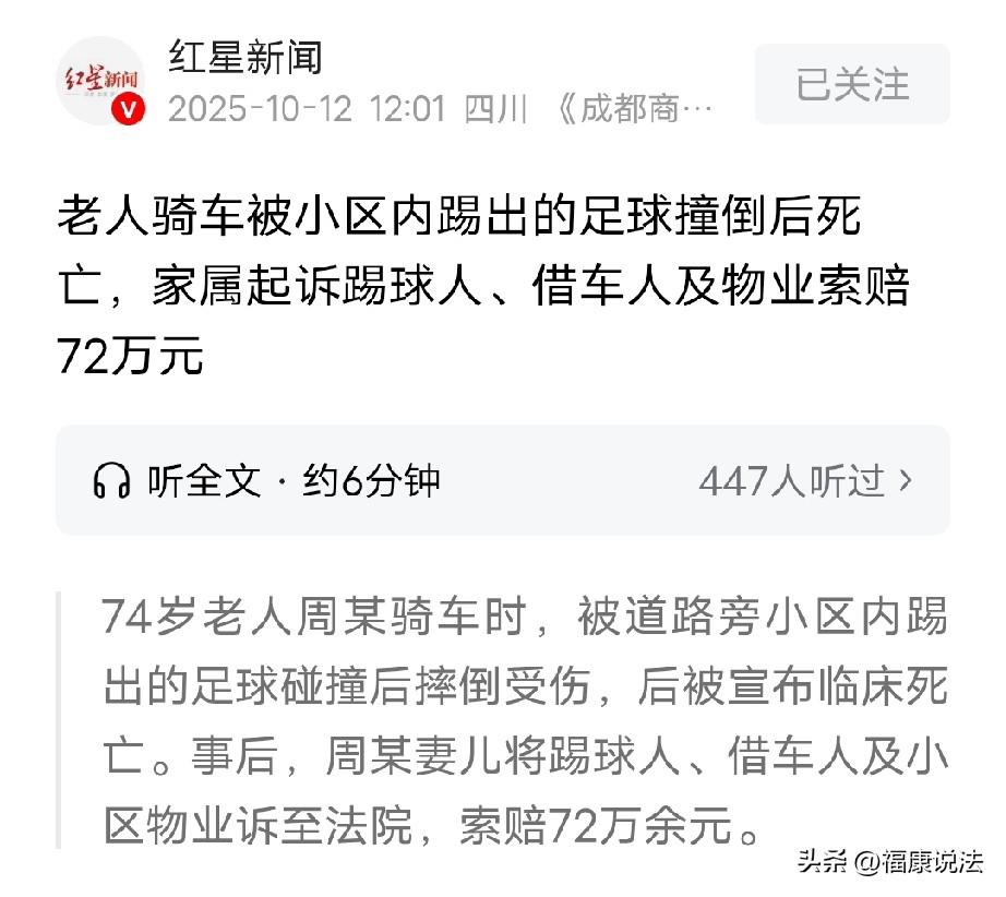 浙江宁波,74岁男子骑着借的电动自行车,载着借车人,突然与飞出的足球碰撞,一下摔倒,二人受了伤,老人脑干出血、肋骨骨折等,经会诊转入ICU监治疗一个月后死亡,事后,老人家属把踢球人、借车人、小区物业告上法院,索赔72万余元,法院一审判决三方共担责65%,不料,踢球人和物业不服上诉,二审判了! 2024年6月17日,晚上7点42分,74岁的周某骑着电动自行车,载着李某,二人经过宁波某小区北门外的道路时一场突如其来的意外发生了…… 与此同时,某小区北门广场里面,裘某正在和6岁的儿子踢足球,裘某想在儿子面前炫一下球技,一脚传球,球飞了过去,儿子却没有接住。 足球穿过小区北侧大门快速滚落到小区外面的路上,好巧不巧偏偏撞在了正在骑车的周某的电动自行车上。 周某骑车哪里防备冷不丁的这一下,他和车连同李某一起摔倒在地,车也摔坏了,二人也受了伤。 事情发生后,周某被送到医院,经过初步诊断,他的脑干出血、肋骨骨折等,经会诊转入ICU,可病情并没有好转。 第二天0点59分,周某因伤势过重转去另一家医院治疗,这时诊断结果更严重了,有创伤性颅内血肿、脑挫伤、创伤性休克、顶骨骨折等,让人揪心的是他的情况不容乐观。 同年7月17号,周某又转入了某康复医院做康复治疗,谁也没想到,第2天晚上6点10分,周某永远的离开了人世。 而他的死因为“闭合性颅脑损伤特重型”。 周某的突然离世,其家属悲痛万分,好好的一个人说没就没了,哪能想到一个足球就那么寸和周某骑的车碰撞到一起呢!这事不能就这么算了。 事后,周某家属一纸诉状将踢球人裘某、借车人李某、小区物业告上法院,索赔72万余元。 经过调查,法院了解到不少情况,事发的道路是双向四条机动车道,两边还有非机动车道和人行道。 道路南侧就是这个小区,小区北侧的场地平时是给业主活动用的,物业公司也没干涉业主在这块场地进行什么活动。 这事法院认为,踢球人、借车人、物业三方都有一些责任。 第一,先说借车人李某的责任。 周某74岁,事发时,他骑的电动自行车是李某的,而且还载着李某。 另外查明,李某的电动自行车没有脚踏功能,还改了限速装置,制动也不符合要求,而且,周某骑车时也没有戴安全头盔。 据了解,事发时周某骑车的行驶速度超过每小时25千米、低于每小时29千米,属于超速行驶。 法律要求车主在出借车辆时,必须确保车辆安全且驾驶人具备合法资格。 李某既未检查车辆安全性,也未提醒周某佩戴头盔或遵守载人规定,对事故的发生负有不可推卸的责任。法院认定其承担10%的责任。 有人说,乍一看,我也认为出借人和物业不应该担责,细看后发现,出借人借车并搭乘,这个就无法免责了。你的车,借给一个七十多的老爷子,自己坐后面,而且不提醒老爷子戴头盔,最终出了事故,确实不可能免责。 第二,再说踢球人裘某的责任。 《民法典》第1188条规定:无民事行为能力人、限制民事行为能力人造成他人损害的,由监护人承担侵权责任。 裘某作为6岁儿子的监护人,在小区北门广场与儿子踢球时,应当预见足球滚落至公共道路可能引发交通事故。 但裘某没有尽到足够注意义务,导致足球滚落撞倒周某并致其死亡。 裘某的过错行为是造成周某受伤的直接原因,因此裘某需承担侵权责任。 法院根据裘某的过错程度,酌定其承担40%的赔偿责任。 第三,小区物业的责任。 《民法典》第942条规定:物业服务人应当按照约定和物业的使用性质,妥善维修、养护、清洁、绿化和经营管理物业服务区域内的业主共有部分,维护物业服务区域内的基本秩序,采取合理措施保护业主的人身、财产安全。 物业公司虽未直接参与踢球行为,但其对小区公共区域的活动负有管理职责。 物业对于小区内的活动场地,可以进行什么样的活动,需要向小区居民提示、告知。 裘某作为小区居民在临近公共道路的广场踢球,就存在安全隐患。 如果物业公司设置了警示标识或及时制止危险行为,可能避免事故发生。 但是,物业没有尽到提醒、告知义务,应当承担相应责任。 法院酌定其承担15%的赔偿责任,体现了对物业管理失职的惩戒。 有人说,球能从球场飞出小区外,球场防护设施严重不到位,踢足球是非容易失控的运动,物业防护高度应严格按标准执行。 第四,法院认定,周某骑车未带头盔,超速行驶,违法搭载李某,存在较大过错需要承担35%的责任。 法院认定,周某妻儿的损失为69.3万余元。 最终,法院一审判决:裘某承担40%责任,赔偿27.7万余元,精神损害抚慰金2万,(另扣除已付的2万)共27.7万余元。 李某承担10%责任,赔偿6.9万余元,精神损害抚慰金5000元,共7.4万余元。 物业承担15%责任,赔偿10.4万余元,精神损害抚慰金7500元,共11.1万余元。 裘某、物业不服上诉,二审维持原判。 关注@福康说法