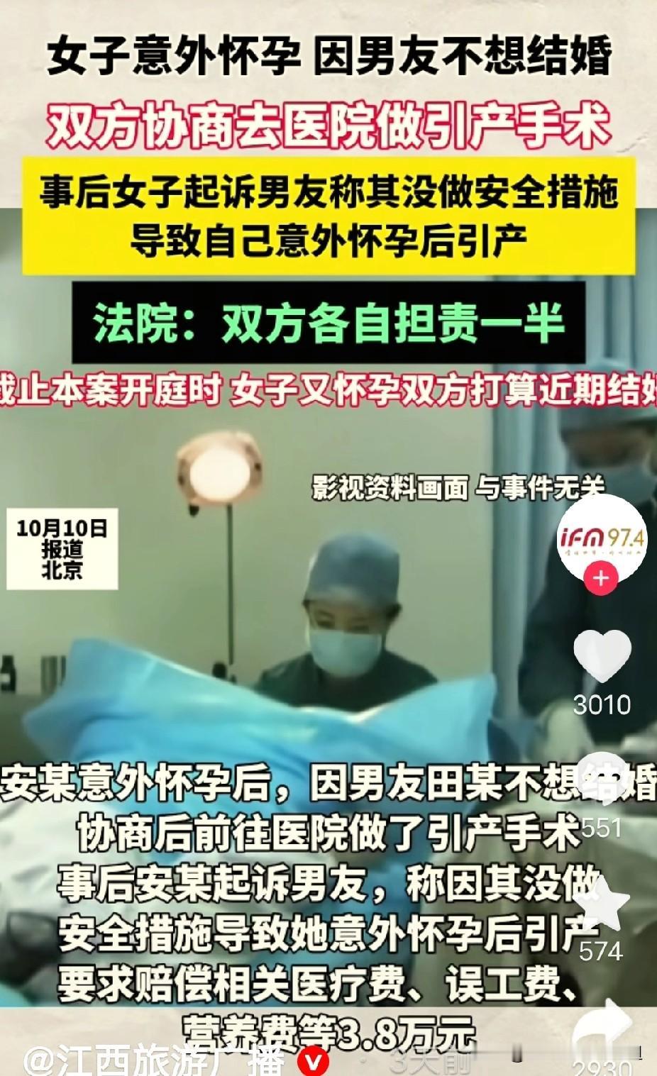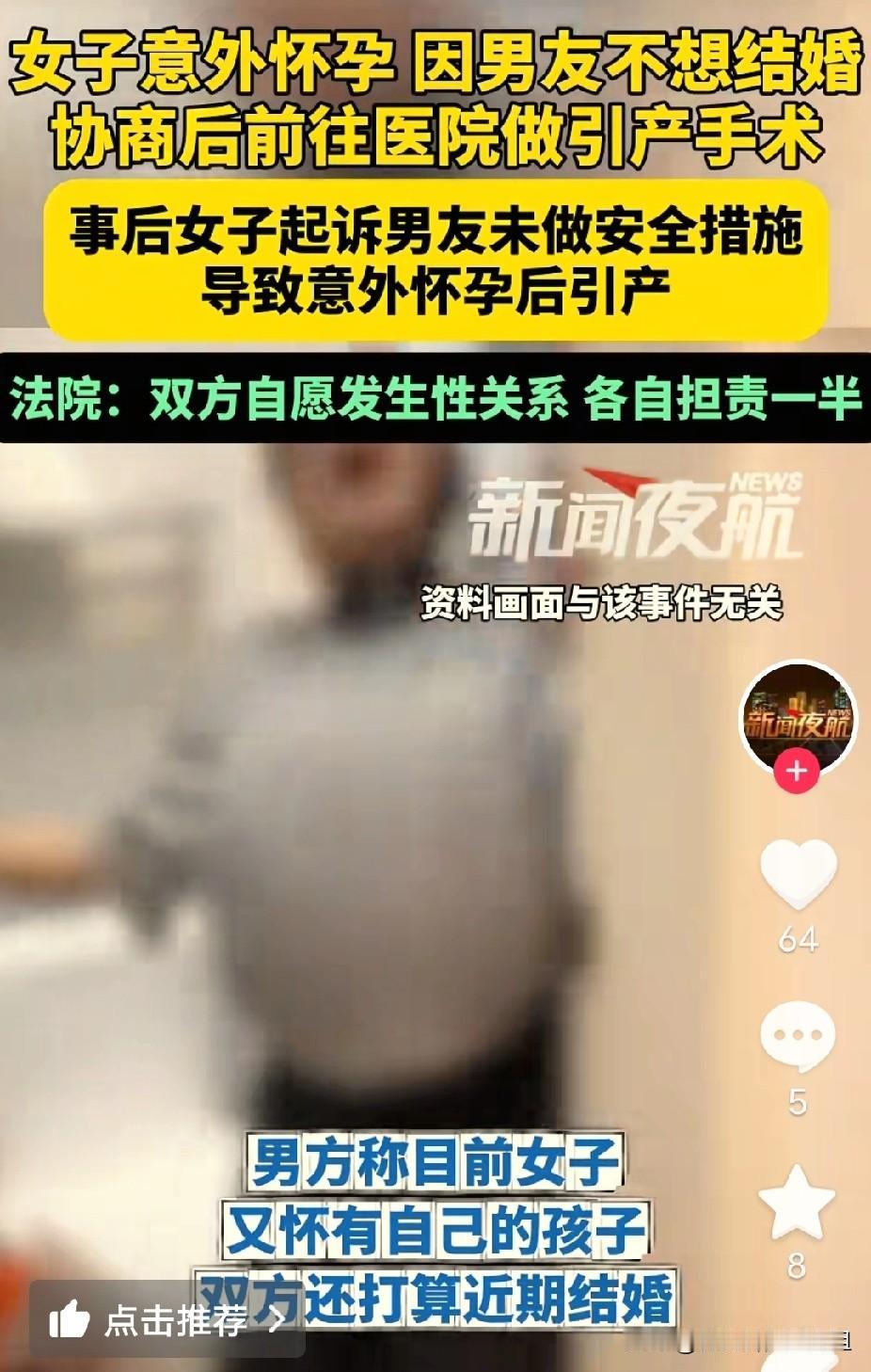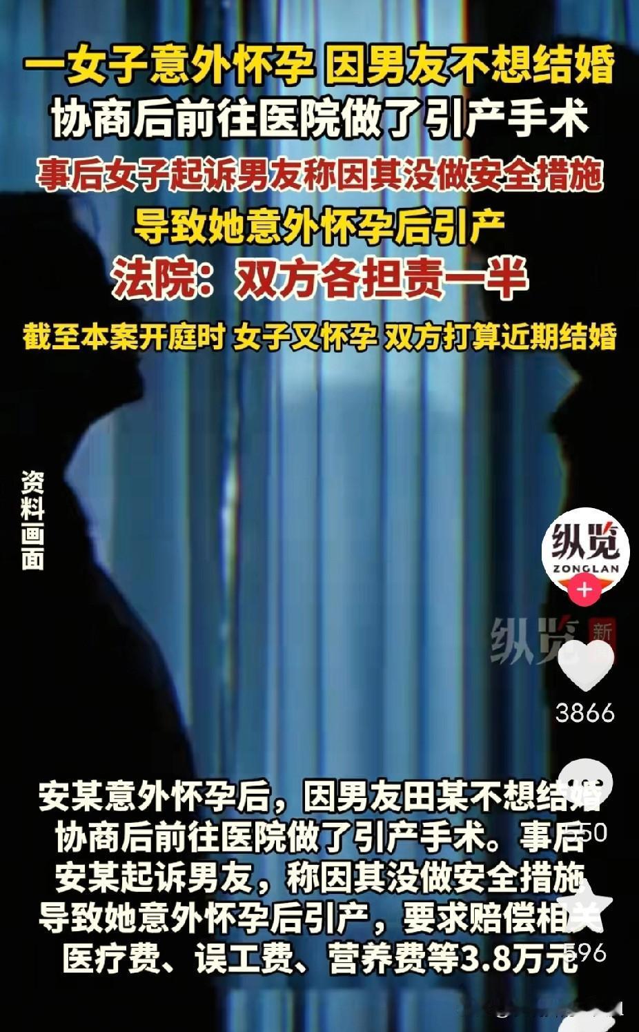 北京大兴,女子意外怀孕,可男友不想结婚,也不想要孩子,两人协商后做了引产手术。结果在事后,女子起诉男友,称其在交往过程中没有做安全措施,这才导致她意外怀孕后引产,要求男友赔偿相关医疗费、误工费、营养费等共计3.8万元。法院这样判了!(来源:裁判文书网 北京大兴区人民法院) 这事儿说起来还真有点戏剧性。法院判决书里透露了不少细节,这对情侣安某和田某,到了开庭那会儿居然还没分手,而且女方又一次怀上了男方的孩子,俩人还打算结婚呢。这关系起伏可比电视剧还曲折。女子去做引产手术时,怀孕已经17周,手术同意书上男友是以家属身份签的字。女方在法庭上说,男方不想要孩子,还在她怀孕期间对她动过手。 法院琢磨来琢磨去,觉得两个成年人你情我愿发生关系,都没太把安全措施当回事,对可能怀上孩子这事儿有点放任不管,所以这怀孕引产的后果,俩人都有责任。法官一拍板,各打五十大板,每人承担一半责任。细算下来,女方这次引产的各种损失一共12467元,男方该掏6233.5元。不过男方之前已经通过转账给了女方8200元,虽然男方说还给了800现金但没证据,法院就认定了那8200块算是赔偿款。因为这钱已经比法院算的赔偿数额多了,所以女方再要钱的请求就被驳回了。 这判决听起来好像挺公平,俩人都有疏忽嘛。但往深里一想,有个地方挺值得琢磨:在这类事情里,女性付出的身体代价和健康风险,往往比男性大得多。就像江苏有个案子,一位女性做引产手术结果出了严重并发症,最后子宫都被切除了,这种伤害是永久性的。虽然这起大兴的案件里没提到这类严重后果,但引产本身对女性身体的负担和不舒服,那是实实在在的。法律上讲双方责任平分,但从身体承受的角度看,这负担的分量可完全不一样。 再看看另一个类似情况,有个案子是男方隐瞒了自己已婚的事实,导致女方怀孕引产,法院最后判男方赔钱,还支持了精神损害抚慰金。这说明要是其中一方存在欺骗或者过错更明显,法院判起来也会考虑加重其责任。回过头看大兴这个案子,双方看起来信息算是透明的,关系也没断,甚至还要继续走下去,这种情形下法院判个对半责任,可能也是考虑到两个人还在共同面对以后的生活。 这件事也给大家提了个醒,成年人处理亲密关系时,得有点责任心和风险意识。采取必要的安全措施,既是对自己负责,也是为对方考虑,能避免很多不必要的伤害和麻烦。真出了问题,就算法律能判个谁对谁错,身体和心理上受的伤,可不是赔点钱就能完全弥补的。 各位读者你们怎么看?欢迎在评论区讨论。