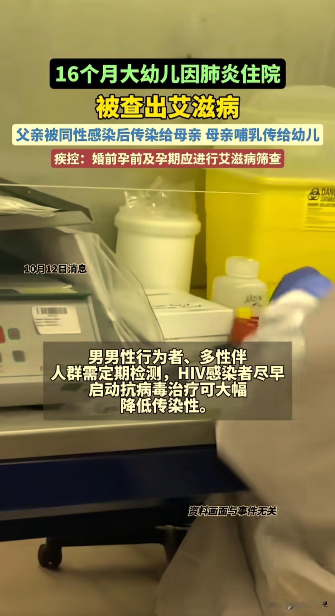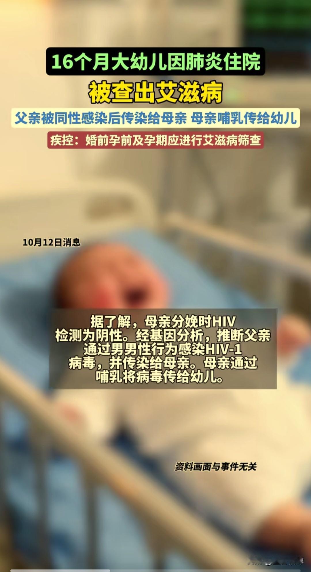 现在人洁身自好很重要啊,广西柳州疾控中心公布了一个案例,福建一个才16个月大的孩子因为支气管肺炎住院,被查出艾滋病。 调查原因竟然是,父亲通过男男性行为被传染了,回去传染了给了妻子,孩子出生分娩是阴性,母亲给孩子哺乳时又传染给了孩子。 大概就是男的在媳妇哺乳期出轨男性被感染,回来传给媳妇,媳妇喂奶孩子再传染给孩子。 疾控提醒,男男性行为、多伴侣人群应定期检测,HIV感染性应尽早启动抗病毒治疗可大幅降低传染性。 不管怎么样,洁身自好最关键,也不要多个性伴侣,做好自我防护最重要。 艾滋病 艾滋病科普 艾滋病症状 艾滋病恐惧症 艾滋病宣传 艾滋病防治宣传 艾滋病检查新规 艾滋病人数 来源:江西民生广播