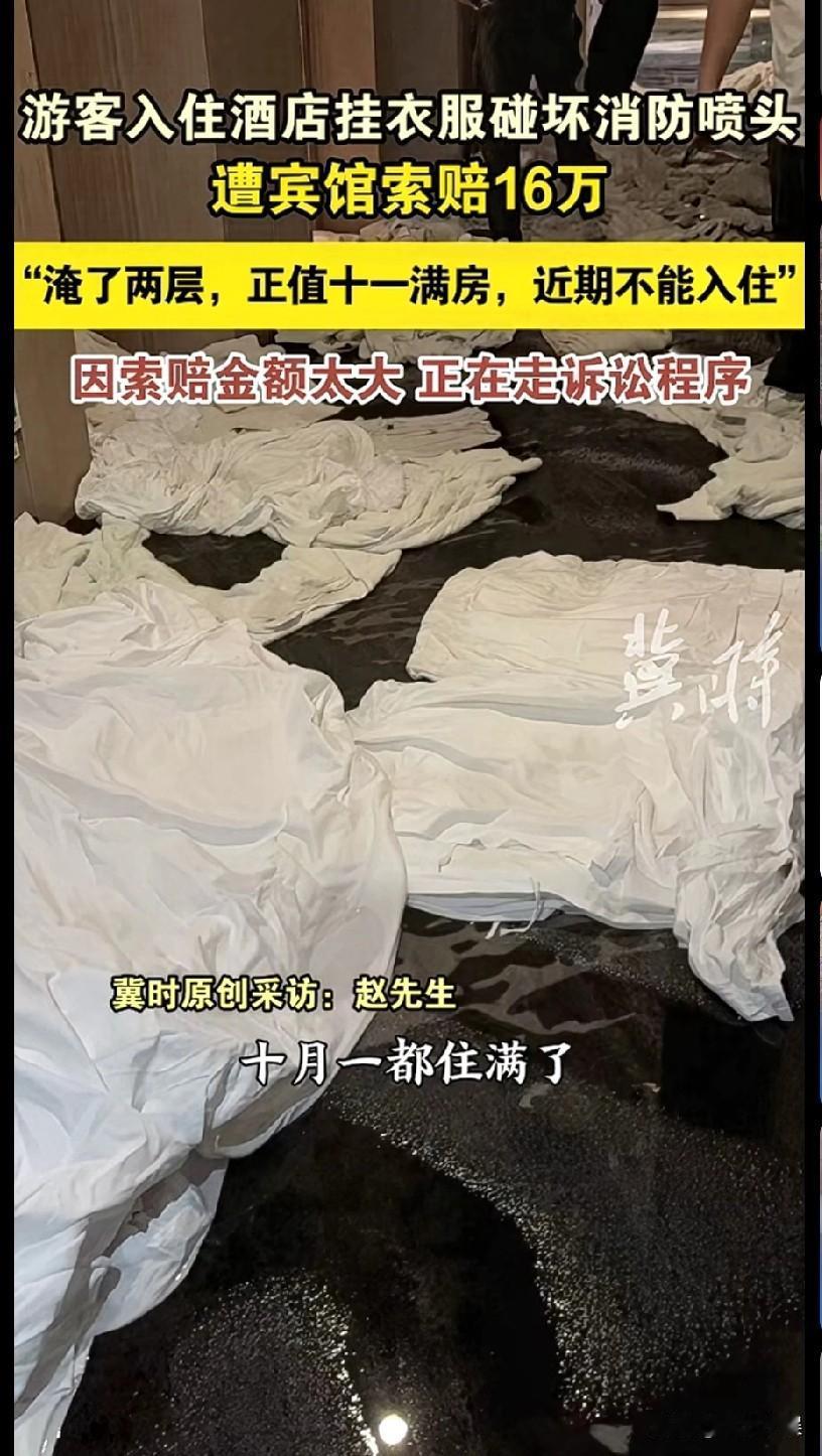 挂个衣服损失16万!十一期间游客入住酒店,游客想要挂衣服,然而游客却选择挂在了棚顶的消防喷淋上,由于喷淋中间的那小玻璃丝很脆,被碰折了,导致了喷淋误喷水。淹了两层,并且十月一都住满了人,客损、地毯、电视等损坏,由于客房被泡,后续旅客不能入住损失,共定损16万,走诉说程序了。 游客这次旅行也是怪闹心的,自己的一次无心之失,造成了如此大的损失。 消防喷淋在棚顶上,够着都有点费劲,这游客居然把衣服挂到了它的上面。 看来学学生活中的常识还是很必要的,如果游客知道这个常识,也不会闯这么大的祸了! 酒店也是的再消费喷淋上应该挂个标识,标注上请勿触碰。以防不懂消防常识的人碰到,造成损失。
