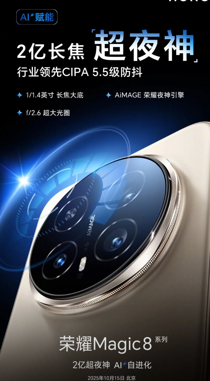 这代的荣耀Magic8系列亮点之一就是补足了大家期许的影像能力!这一代的Magic给大家带来了2亿长焦超夜神,具有行业领先的CIPA5.5级防抖能力、1/1.4英寸长焦大底、f/2.6超大光圈以及Ai MAGE荣耀夜神引擎,目前已经上手的媒体老师都反馈这次荣耀在影像方面着实打了个翻身仗!