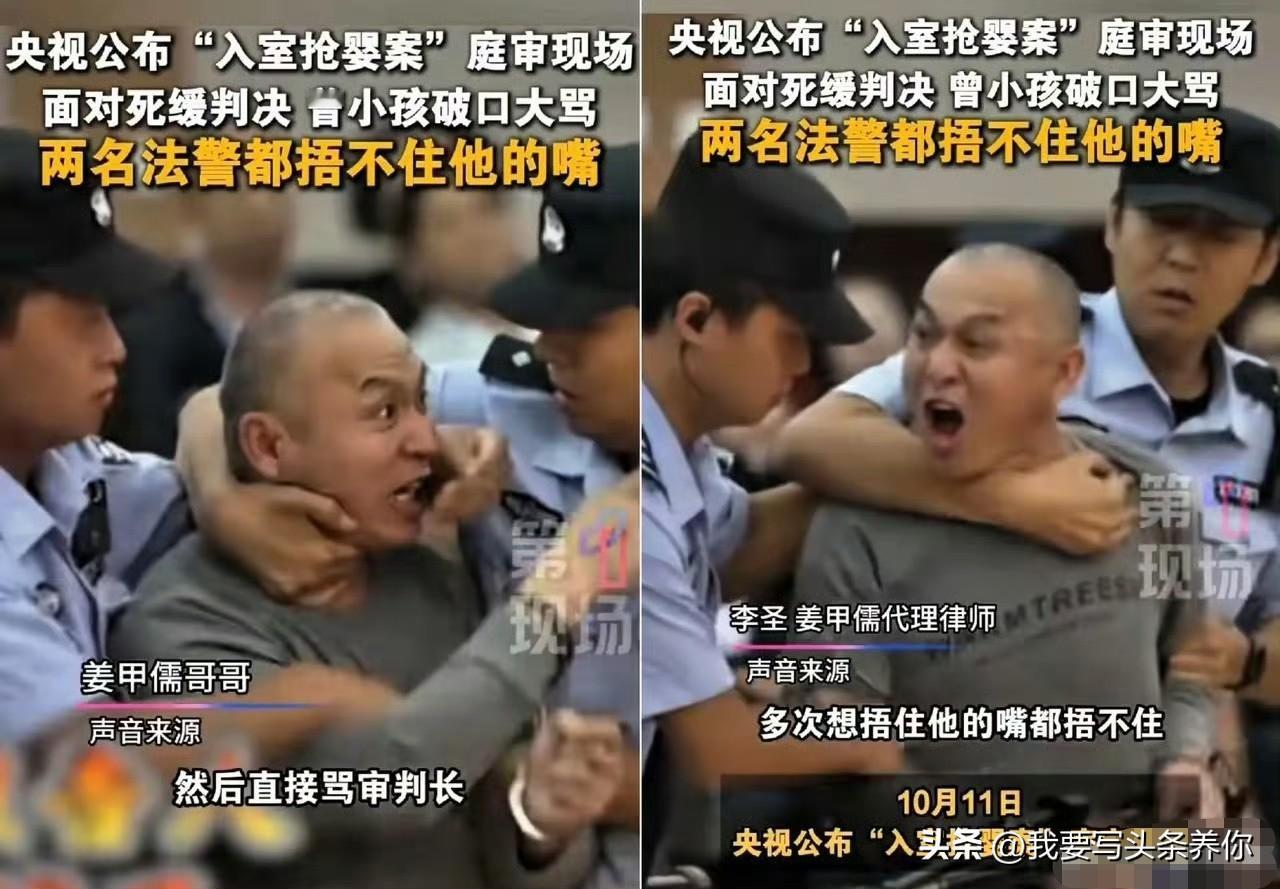 央视公布“入室抢婴案”庭审现场面对死缓判决,曾某孩破口大骂。两名法警多次想捂住他