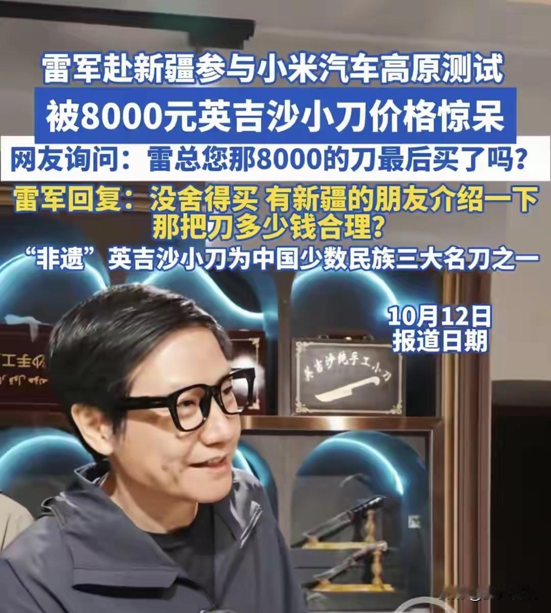 万万没想到,身价几百亿的雷军也舍不得买一把8000元的英吉沙刀!那把刀卖8000元很合理,那可是纯手工打造的,是非遗! 只能说雷军是个技术男,他只穿凡客,不穿那些奢侈品,那是他对老友陈年的一份信任和承诺! 很多人在说小米这样不好,那样不好,可是没有人想过,如果没有小米,很多人要很久才能用上智能手机,在那个年代! 小米就算有再多的不好,也改变不了小米是拓荒者的现实! 在任何行业,一条鲶鱼都值得尊敬! 只能说,雷军是懂营销的,那把英吉沙小刀也不是他买不起,只是他没接触过的领域罢了! 努力的人都值得尊重!