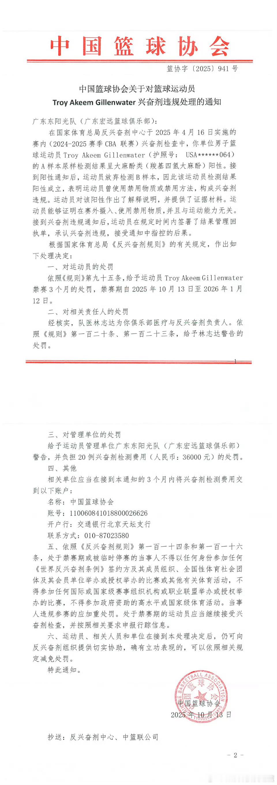 cba外援兴奋剂违规吉伦沃特因兴奋剂违规被禁赛3个月