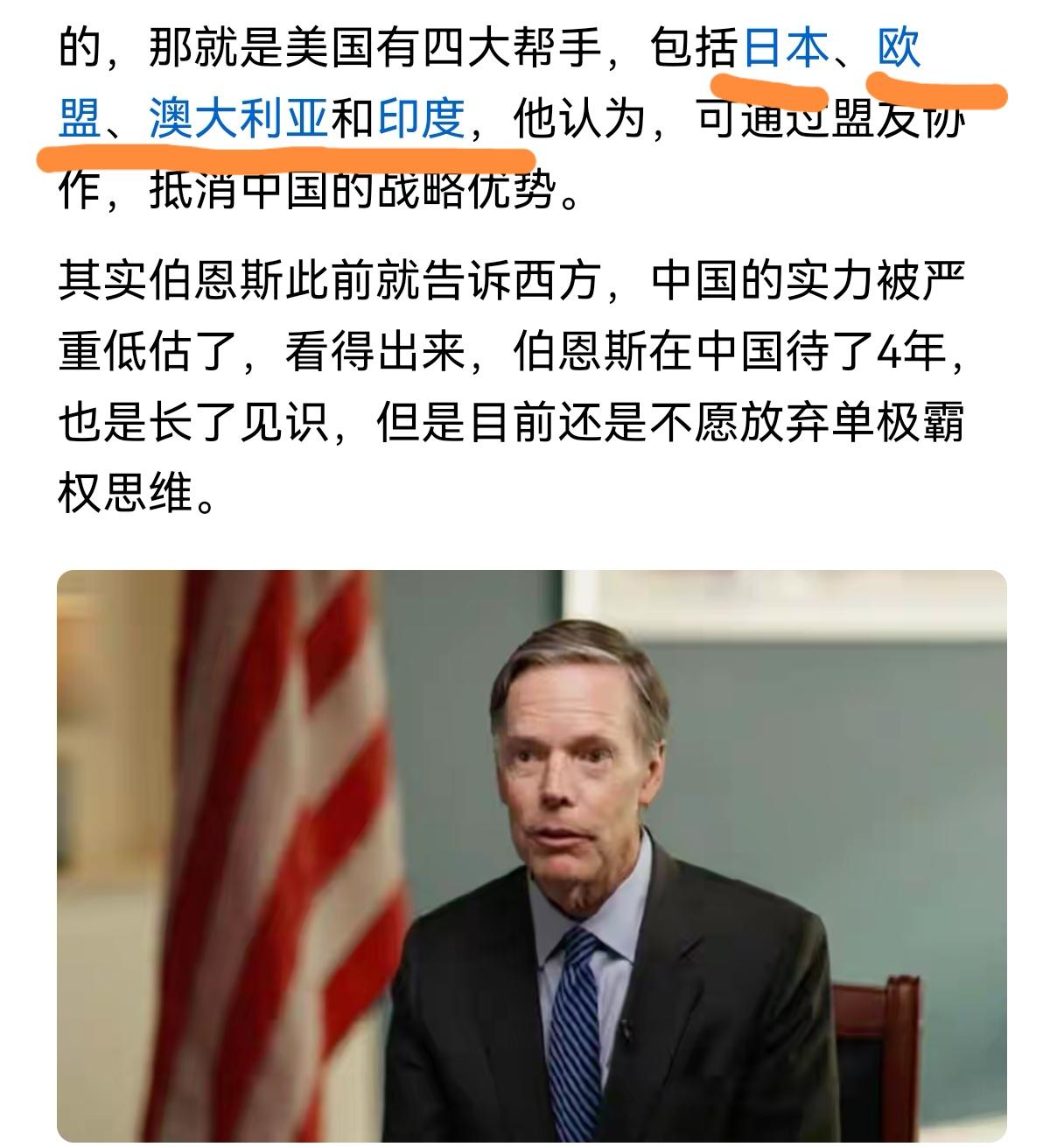 好笑:美国的四大打手 美国不仅欺负弱小,而且还拉帮结派,公共说自己有四大“帮手”。日本、欧盟、澳大利亚和印度都是见风使舵之徒,美强则倚美,美弱同样攻美,哪是什么帮手。现阶段这四大打手是美国的帮凶,倒是名副其实。