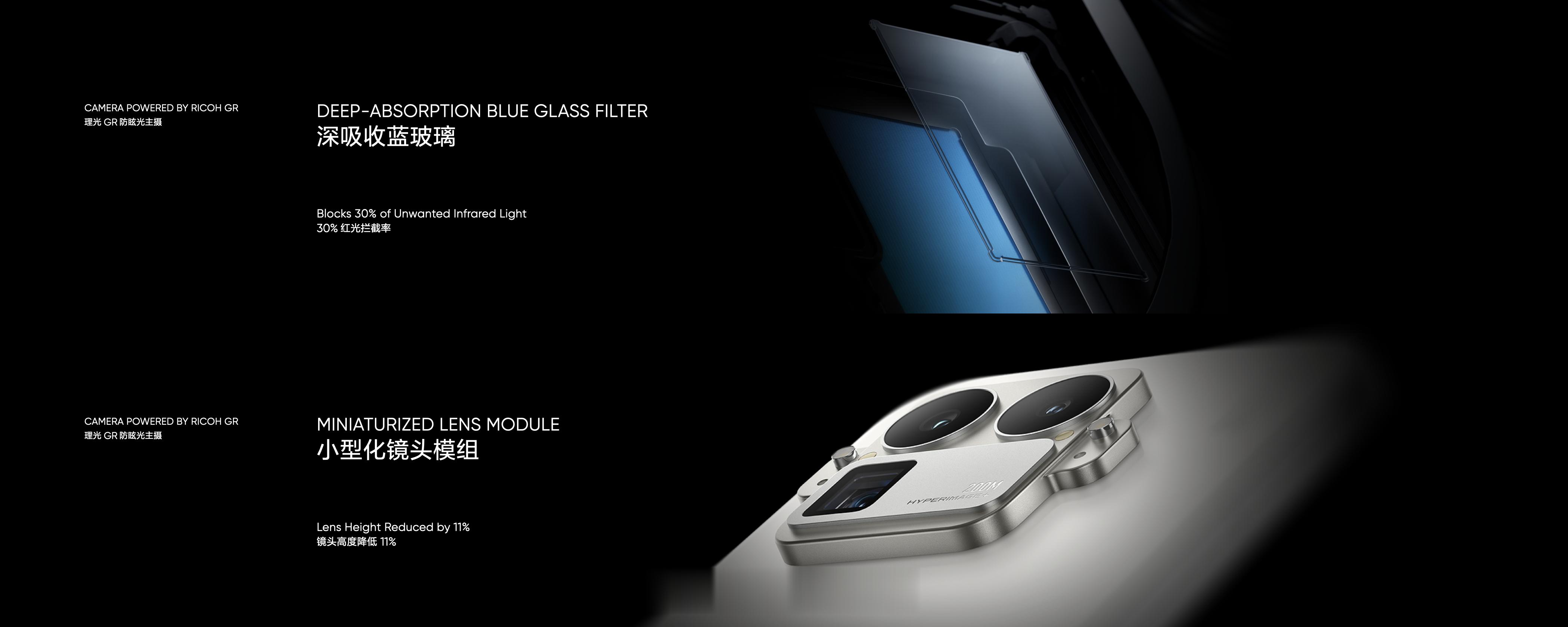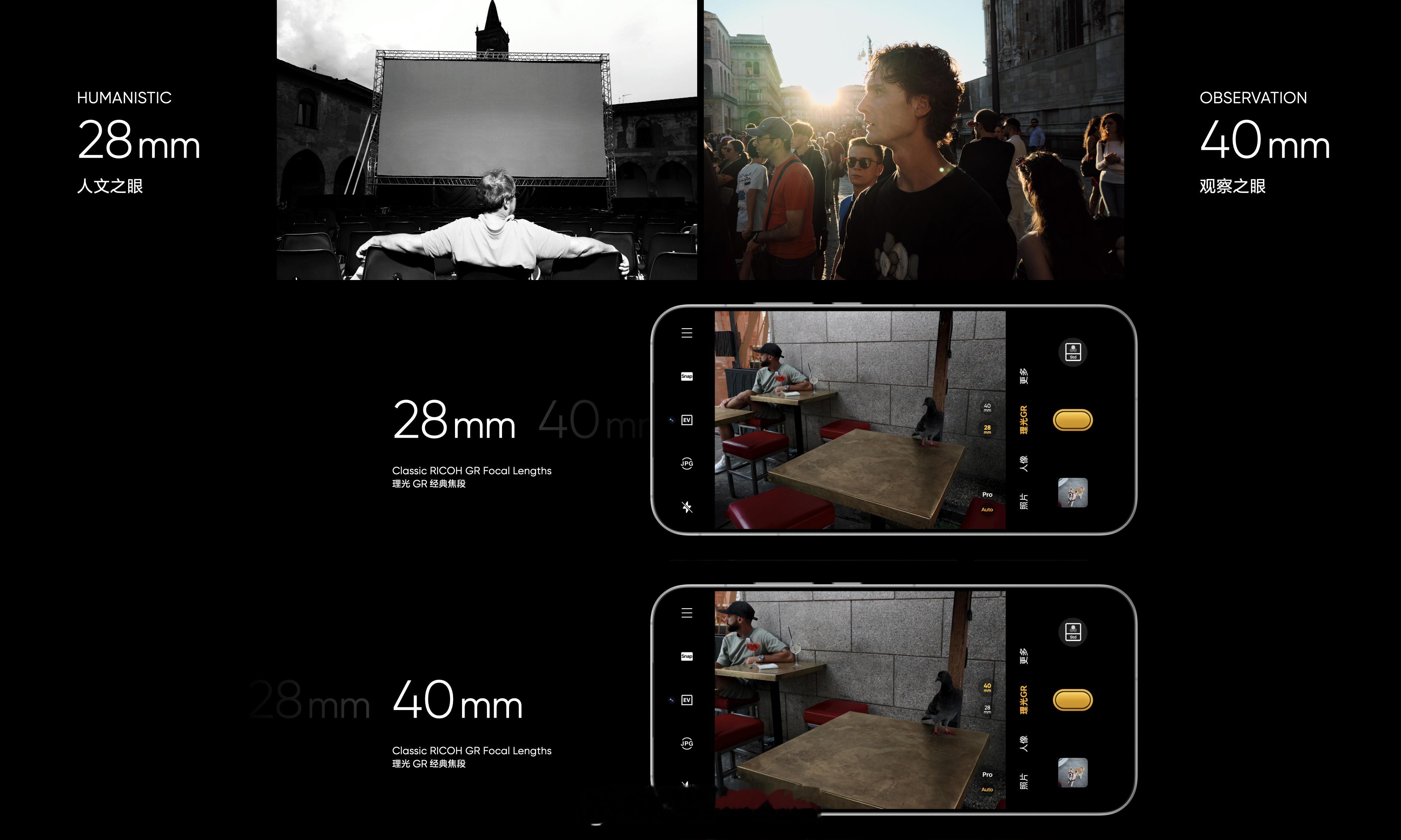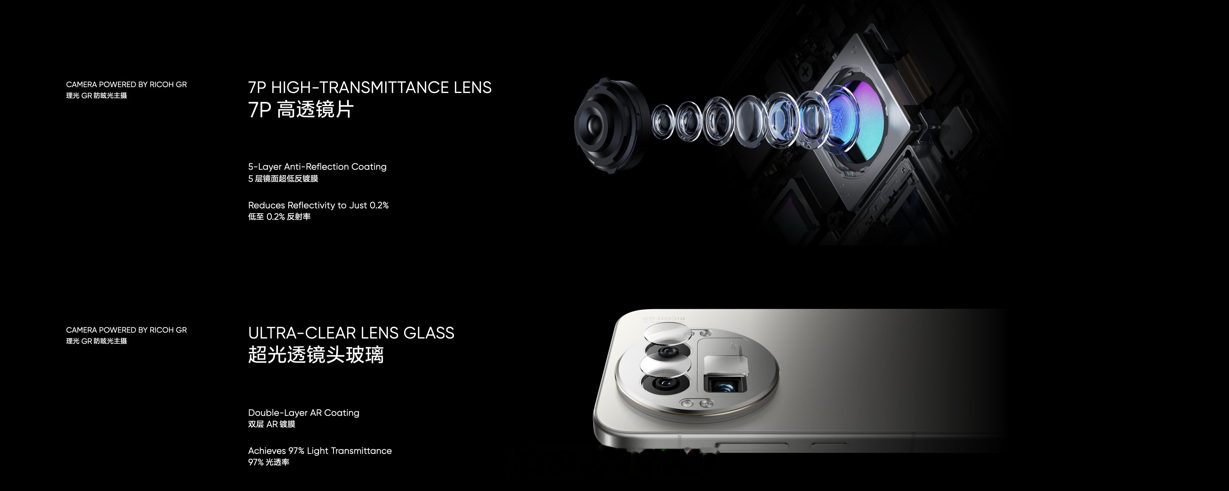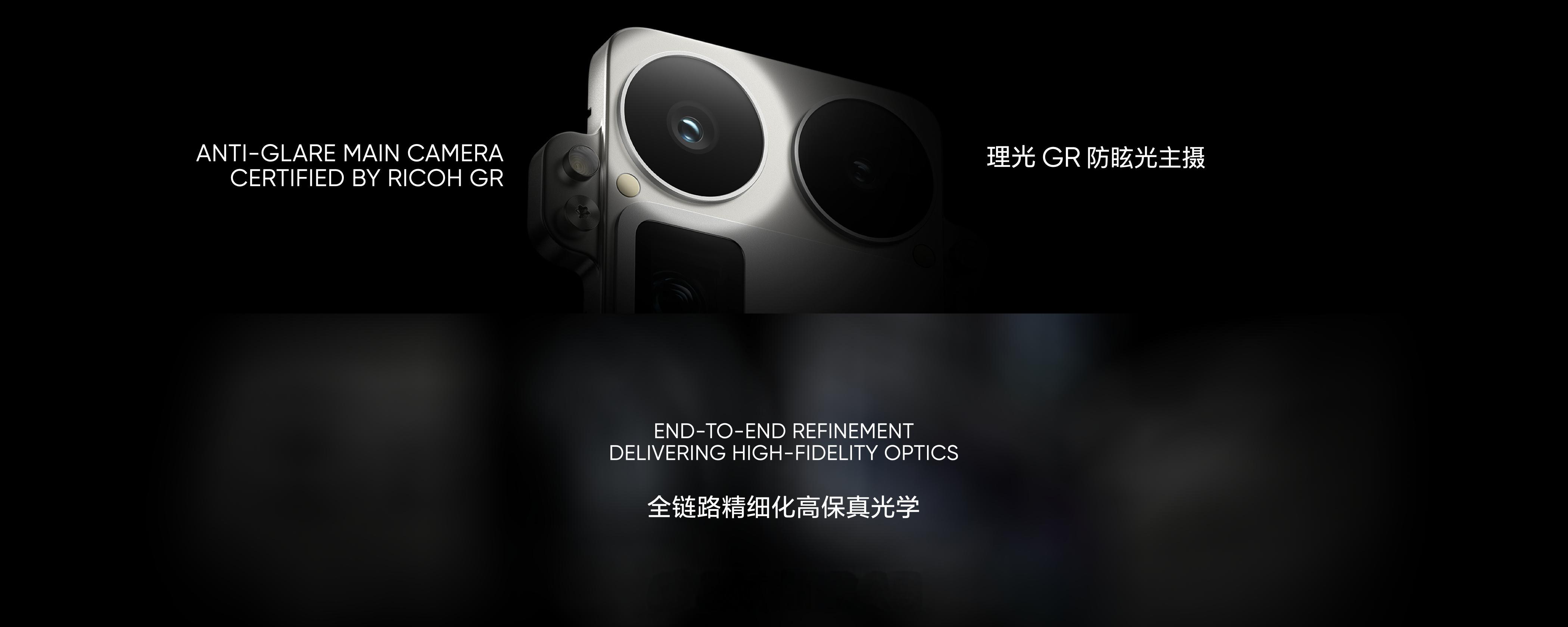 硬件方面,真定制理光 GR 防眩光主摄,并且通过了理光 GR 光学验收(超光透镜头玻璃+双层 AR 镀膜,高规 7P 高透镜片+5 层镜面超低反镀膜,深吸收蓝玻璃+IR 旋涂滤镀膜)