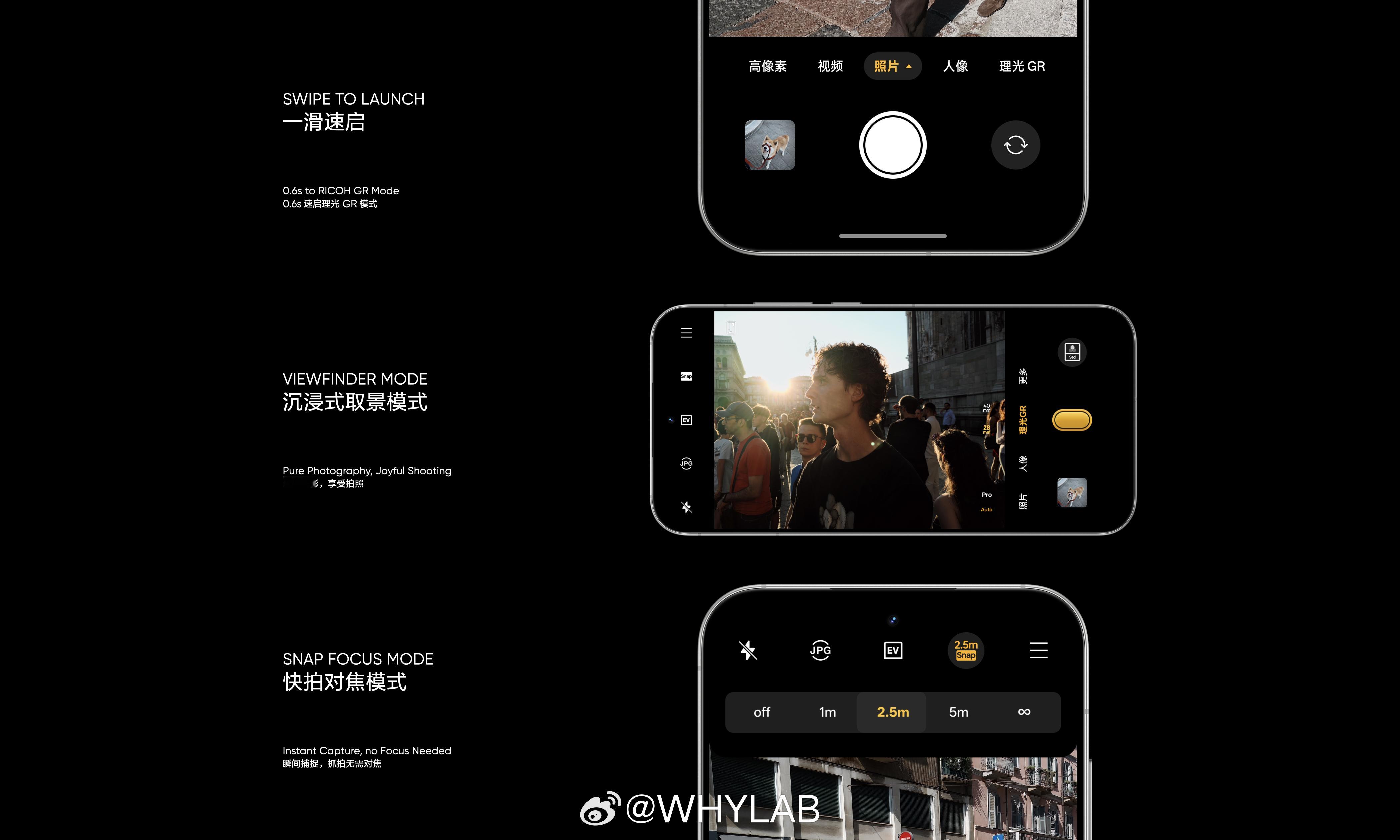 软件方面,理光 GR 模式一划速启,搭配理光 GR 经典快门样式,仅支持 28mm、35mm、40mm、50mm 四个焦段;提供沉浸式取景模式、快拍对焦模式;理光 GR 直觉影像算法引擎,正片、负片、标准、高对比黑白、单色五大理光 GR 胶片影调。