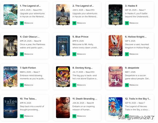 评分汇总网站Metacritic通过官方社交账号公布了截至目前2025年评分最高