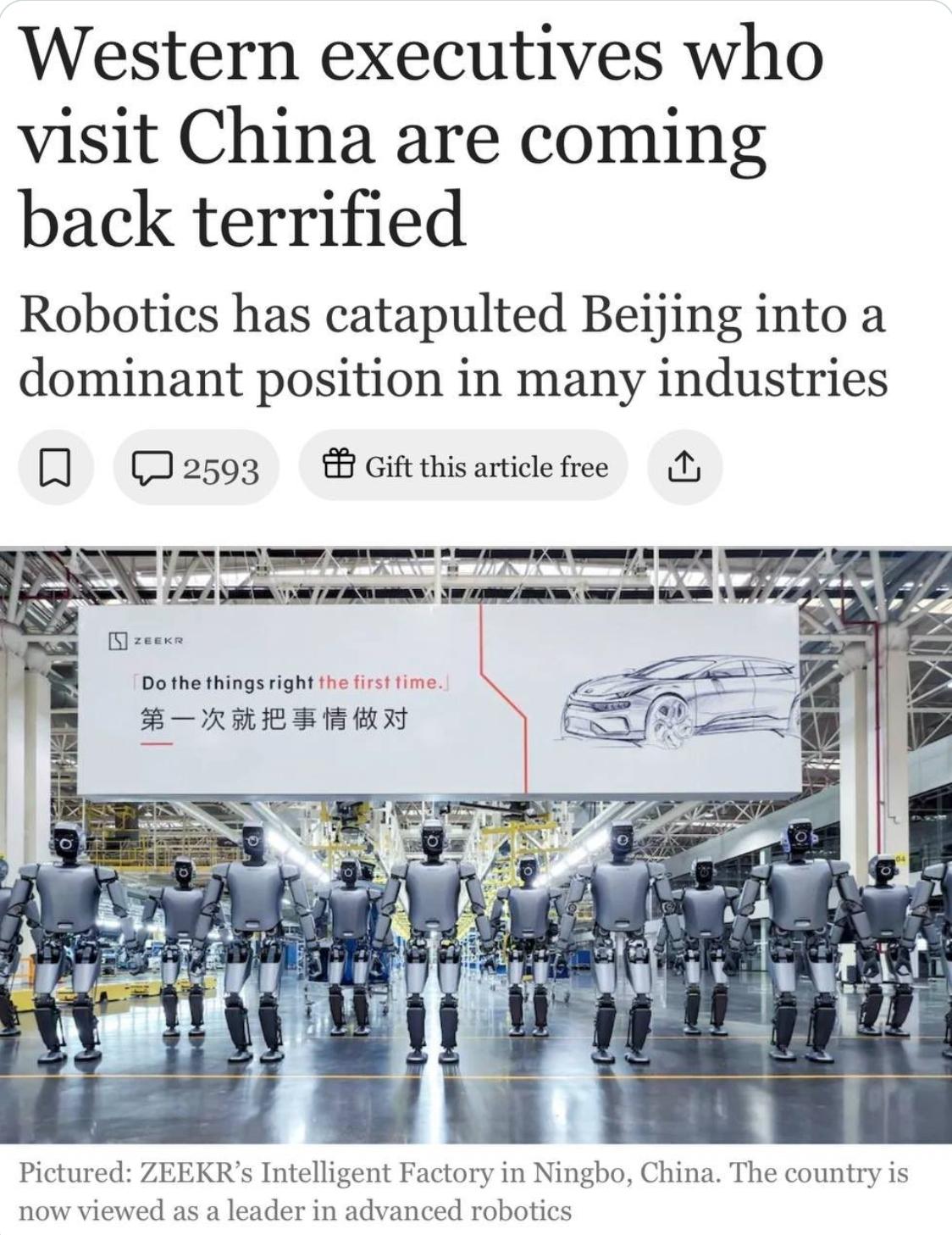 西方科技领袖访华归来:中国制造效率鸿沟震慑全球 在全球制造业竞争白热化的当下,西方科技公司高管在访问中国后,带着震撼与谦卑返回家园。他们亲眼见证了中国从“廉价劳动力”向“智能制造帝国”的飞速转型:机器人主导的“黑暗工厂”、无人驾驶的智能港口,以及在质量、技术和成本上全面领先的电动汽车产业,正让西方企业感受到生存危机。据英国《每日电讯报》2025年10月12日报道,这一效率差距正在持续扩大。本文基于最新数据,剖析中国制造的崛起及其对全球工业格局的深远影响。工业机器人:中国“机器人帝国”崛起中国制造业的自动化水平已远超西方。根据国际机器人联合会(IFR)《世界机器人报告2025》,截至2024年底,中国工业机器人存量达295,000台,占全球近70%,较2023年的276,000台增长7%,得益于“中国制造2025”战略推动。相比之下,美国仅34,000台,英国更低至2,500台,2024年安装量下降35%。中国工厂的机器人密度高达392台/万名工人,远超美国的285台和英国的111台。西方高管参观中国工厂时,常被“黑暗工厂”震撼:这些全自动化生产线无需人工照明,机器人24小时运行,年产手机或汽车部件数亿件。英国Octopus Energy首席执行官Greg Jackson感叹:“一座黑暗工厂只需少量监督团队,就能实现惊人产量。”澳大利亚Fortescue Metals Group创始人Andrew Forrest也表示:“机器自动组装部件,我们无法匹敌。”这暴露了西方在自动化投资上的滞后。上海港:无人物流的全球标杆上海港作为全球最大集装箱港口,年吞吐量超4900万TEU,其自动化水平令西方高管瞠目。杨山港四期工程是全球最大自动化码头,80辆自动导引车(AGV)与16台岸桥吊机无缝协作。2025年,港口引入无人集装箱船和5G远程操控系统,操作员在控制塔通过多屏界面遥控设备,效率提升30%,事故率近零。依托华为等本土科技,上海港实现路径优化和故障预测,远超西方港口如鹿特丹或汉堡。2025年,中国13个港口部署无人集装箱卡车,巩固全球物流霸主地位。一位西方物流高管惊叹:“这不是港口,是未来城市的神经中枢。”电动汽车:中国“质技价”全面领先在电动汽车(EV)领域,中国的优势令西方车企胆寒。福特汽车首席执行官Jim Farley在2025年Aspen Ideas Festival上坦言:“中国电动车在技术、成本和质量上远超西方。”他多次访华,亲测小米、华为的EV:AI助手无缝集成导航和娱乐,产量占全球EV的70%。他警告:“若竞争失败,福特无未来可言。”中国EV巨头比亚迪2025年9月在英国销量暴增10倍,超越Mini和路虎。其Seagull车型售价仅1万美元,配备LFP电池和高级驾驶辅助系统,内饰媲美豪华品牌。福特计划的3万美元EV平台预计2027年上市,落后中国3-5年。SMMT首席执行官Mike Hawes表示:“中国汽车业从‘廉价’转型为高科技领导者,速度惊人。”效率差距扩大:西方的生存危机《每日电讯报》指出,中国机器人安装量占全球74%,而西方工厂利用率仅55%,受地缘政治和投资不足拖累。两位西方能源公司领袖报告中国“黑暗工厂”的能源效率和零废品率,令人震撼。专家警告,若不加大自动化投资,西方工厂可能彻底关停。西方需借鉴中国:加强公私合作、补贴创新,并放宽科技巨头进入制造业的限制。否则,如Farley所言,输掉竞争的企业将无未来。中国模式表明,自动化与智能化是重塑经济的关键。西方若不加速行动,将在全球工业革命中被抛下,面对“空荡荡的黑暗工厂”。