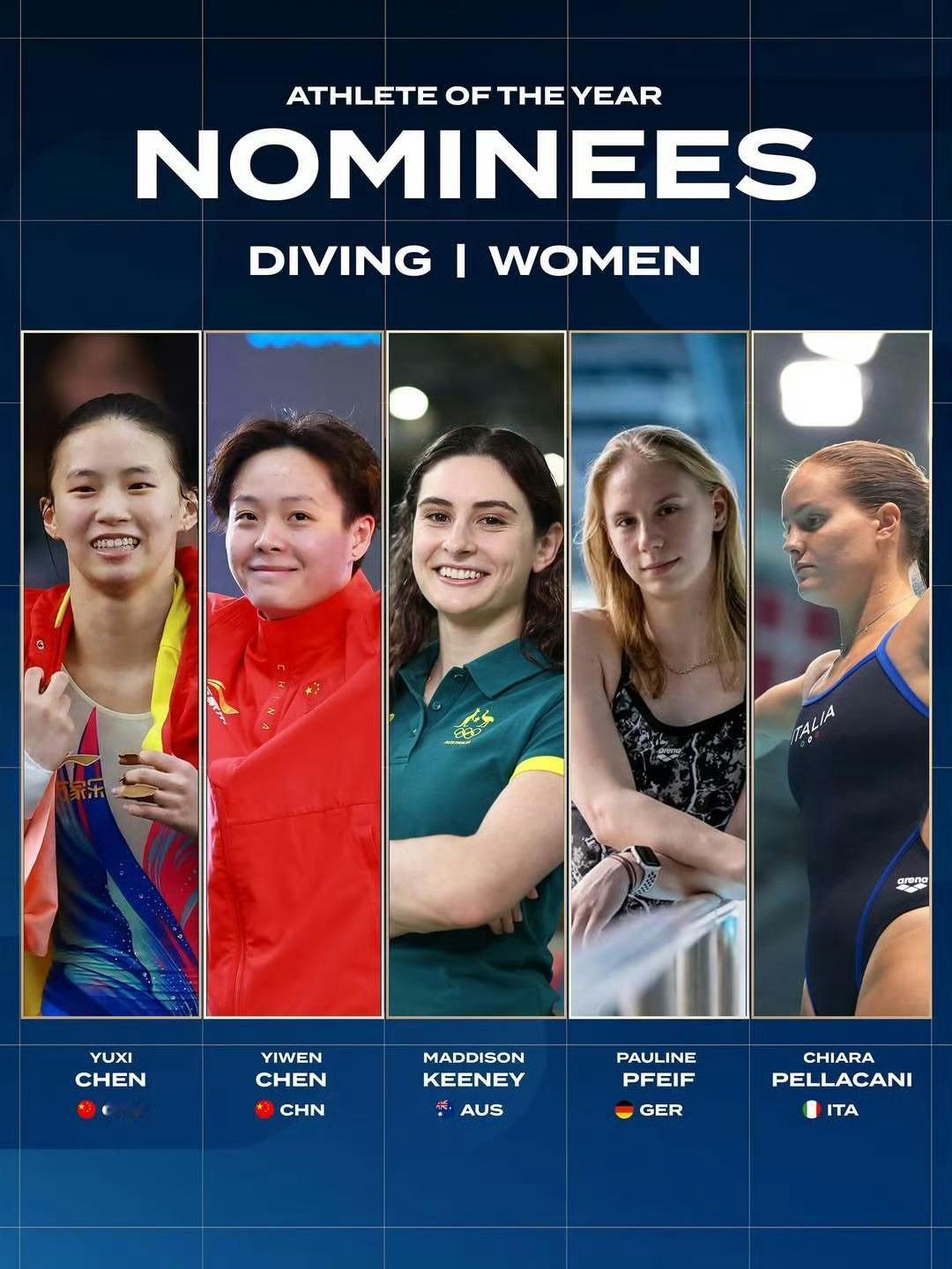 世界泳联2025年度最佳女子跳水运动员评选,中国跳水队的陈芋汐和陈艺文入围,期待