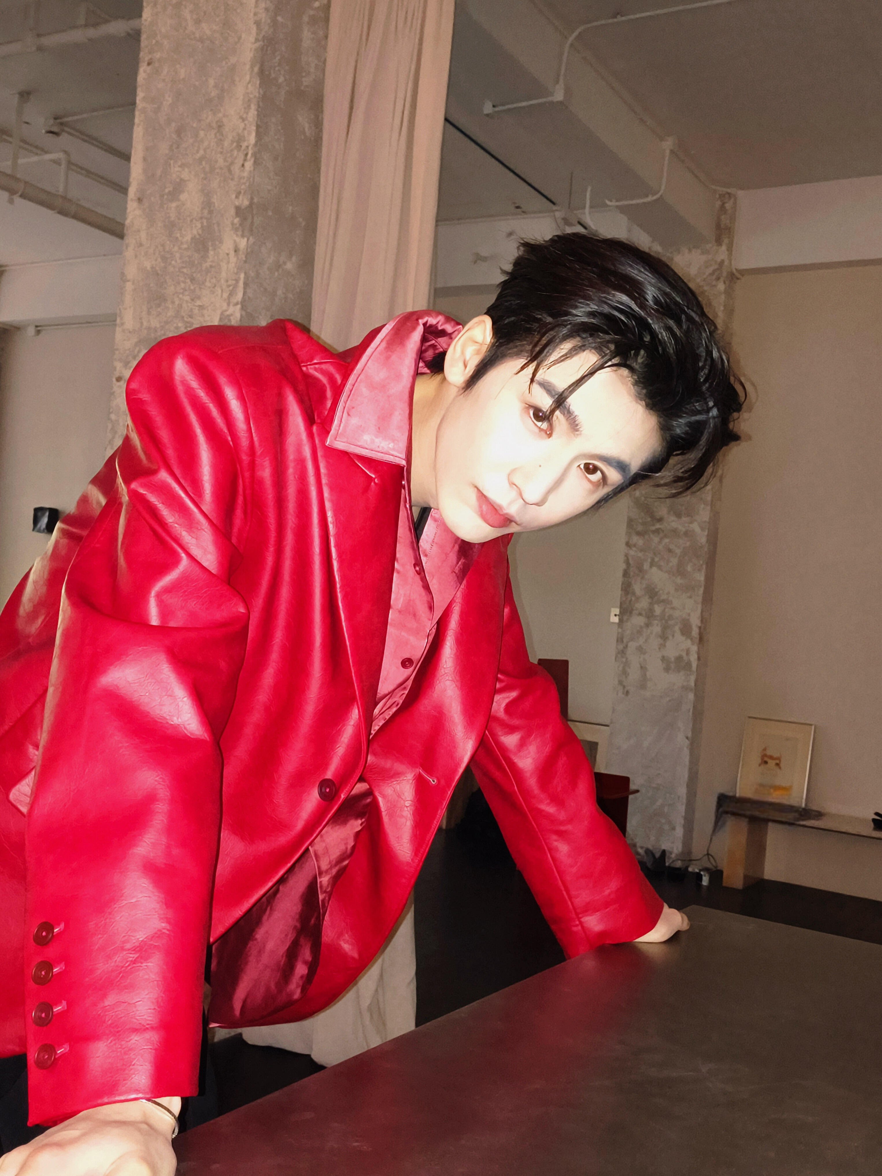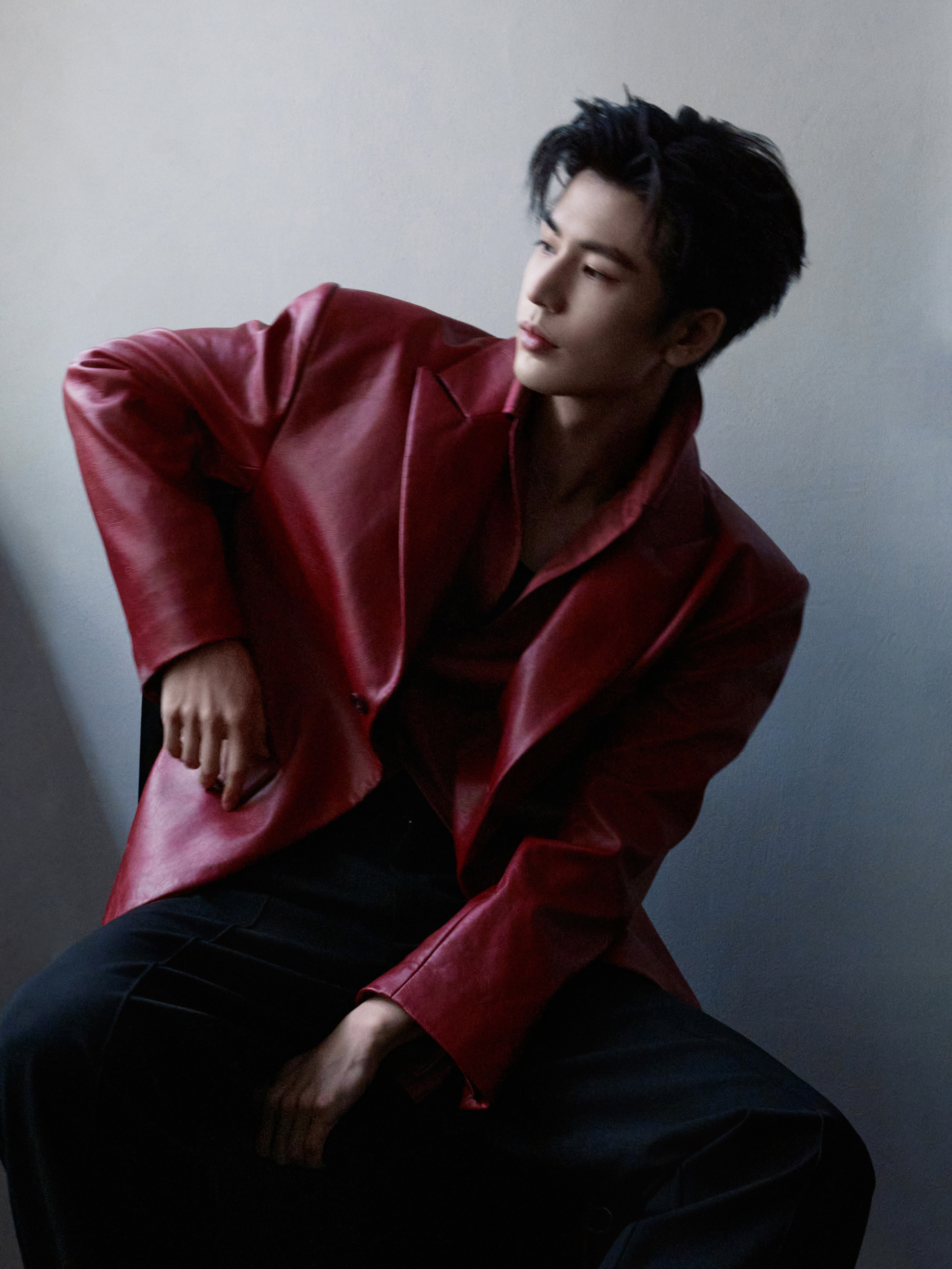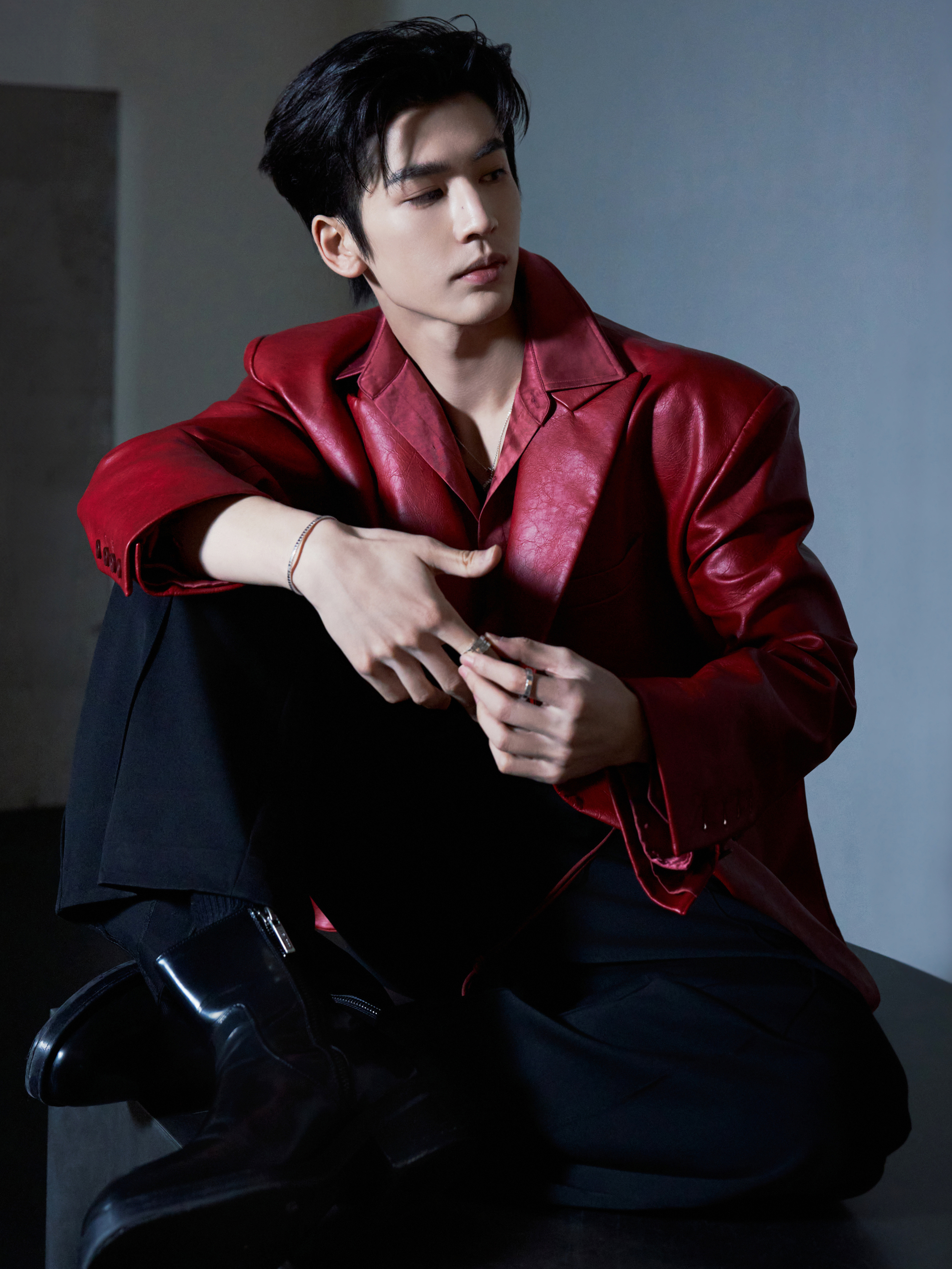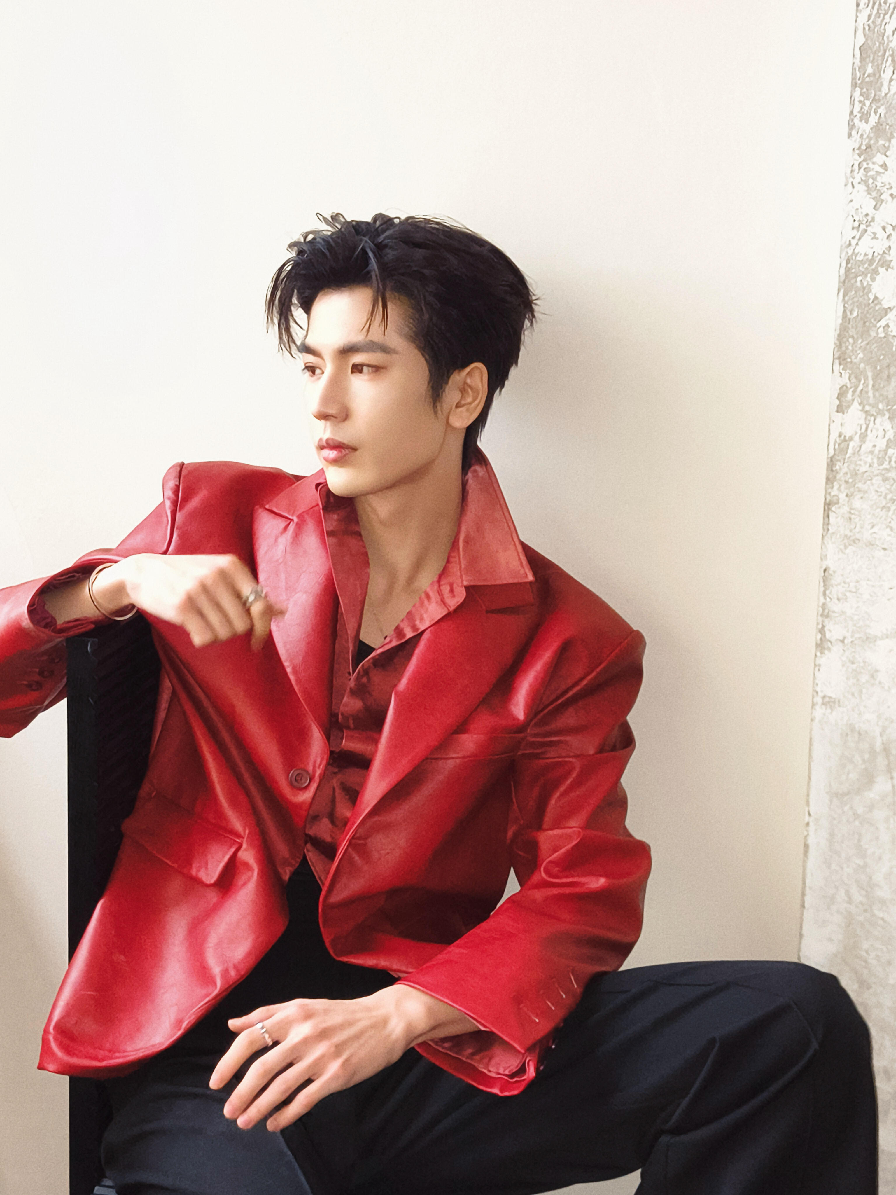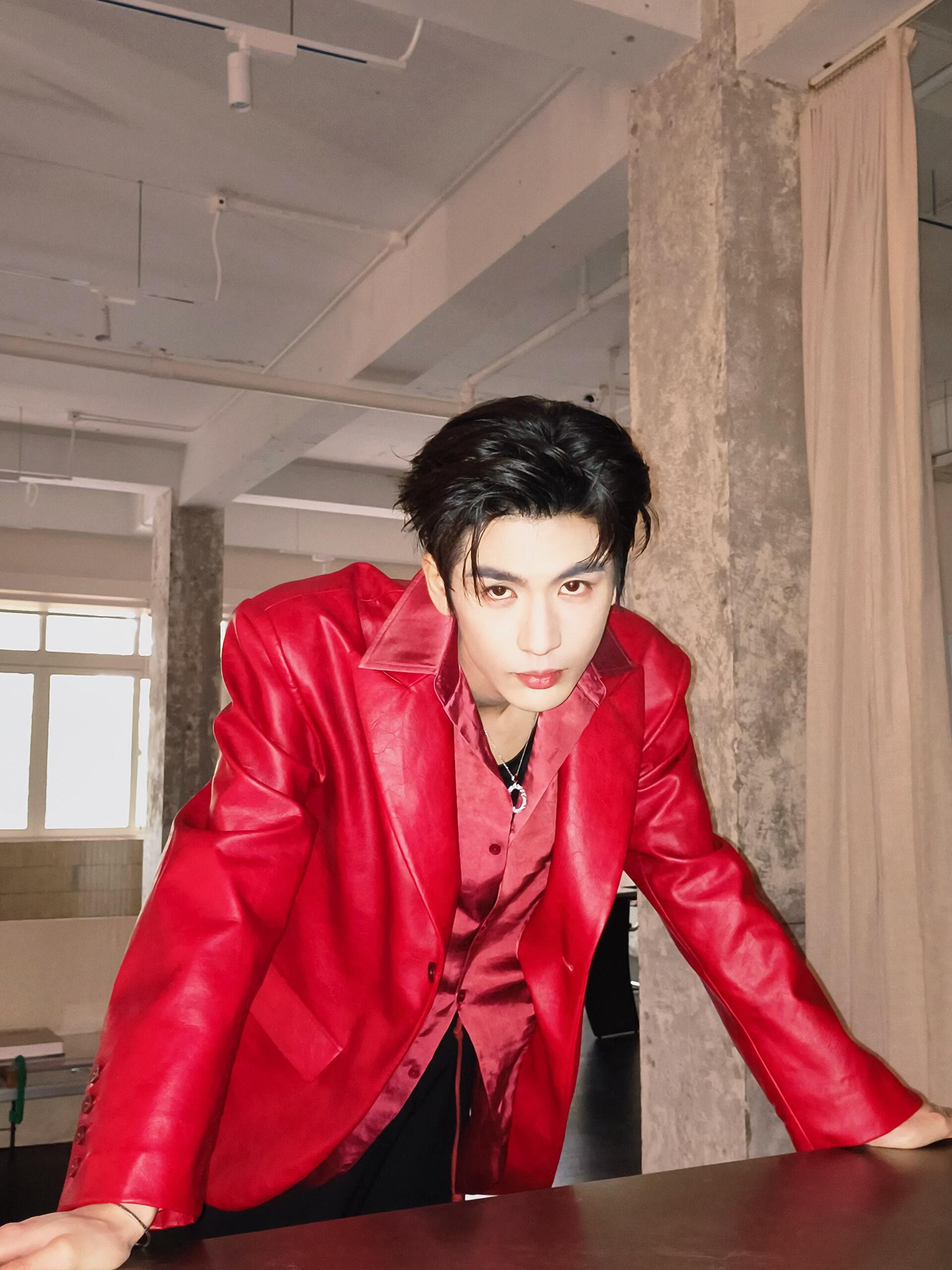 张凌赫 × RELLET 颐莲活动造型图集,一袭红色皮质西装搭配利落黑色长裤出镜,Chopard 珠宝点缀于手腕指间,与红色适配度拉满的全球代言人🔴
