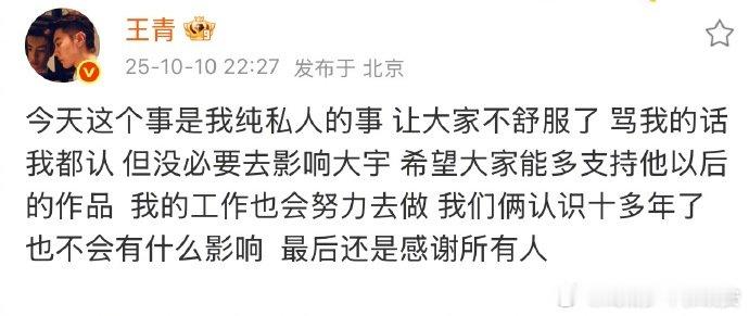 王青发文道歉王青 不要因为我影响冯建宇 发文道歉:“今天这个事是我纯私人的事 让大家不舒服了 骂我的话我都认 但没必要去影响大宇 希望大家能多支持他以后的作品 我的工作也会努力去做 我们俩认识十多年了 也不会有什么影响 最后还是感谢所有人” ​ ​​​