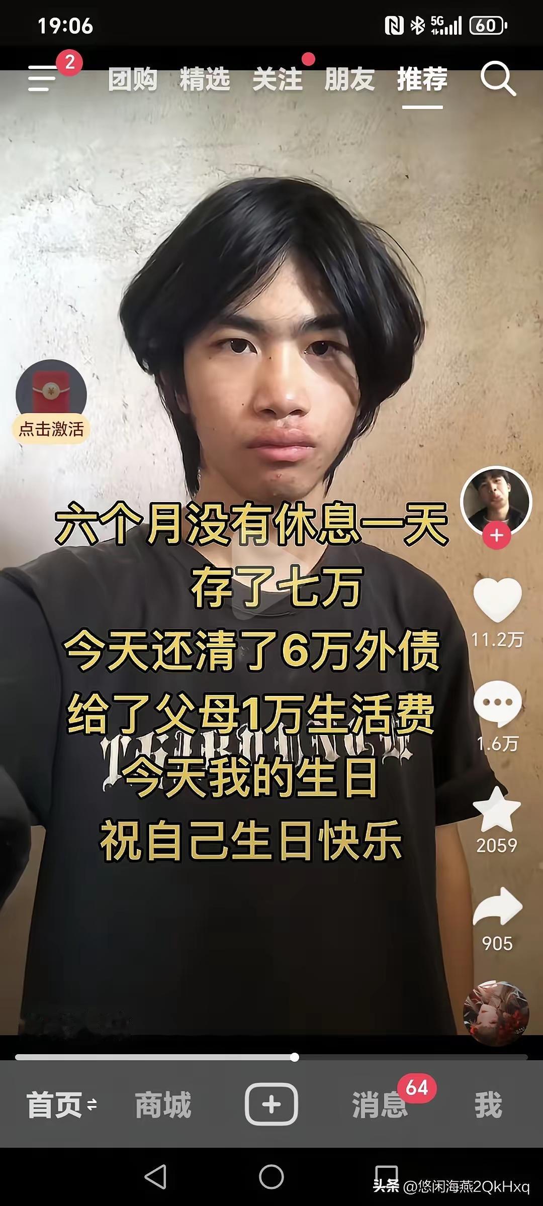 六个月未曾休息一日,存下了7万。今日,还清6万外债,又给了父母1万生活费。今天恰逢我生日,祝自己生日快乐! 孩子,你真是好样的!爹妈有你这么个好儿子,倍感骄傲。首先一定要保重身体,毕竟有了好身体才有一切。好孩子,你是最出色的,叔叔祝你生日快乐! 这段话洋溢着温暖与感恩,也彰显了你坚韧不拔、积极向上的生活态度。以下是对你的祝福与一些感悟: 对你的祝福: 生日快乐!愿你在新的一岁里健康平安,心想皆成! 身体健康至关重要:诚如你所言,唯有身体康健,方能拥有一切。望你悉心照料自己,保持良好的生活习惯。 家庭幸福美满:你为父母还清外债,给予他们生活费用,尽显你对家庭的担当与关爱。 坚持与努力可嘉:六个月不休一天,存下7万,足见你努力奋进、坚韧不拔。 感悟与鼓励: 你是家中的骄傲:你的付出与坚持,让父母深感自豪。 继续奋勇前行:未来的路尚长,愿你持续保持积极心态,迎接更多挑战,收获更多幸福。 珍惜当下时光:忙碌之余,也别忘了给自己留些放松与快乐的时刻。 祝你在新的一岁里,健康、幸福、顺遂!你是最棒的!
