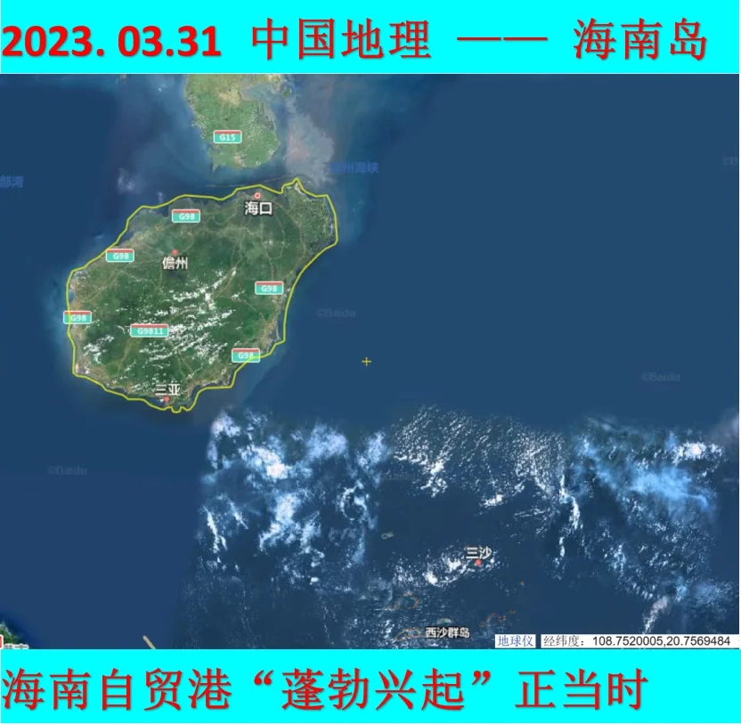 🌐海南岛北与广东雷州半岛相隔的琼州海峡宽约18海里,是海南岛与大陆之间的“海上走廊”,也是北部湾与南海之间的海运通道。从岛北的海口市至越南的海防市约220海里,从岛南的三亚港至菲律宾的马尼拉港航程约650海里。