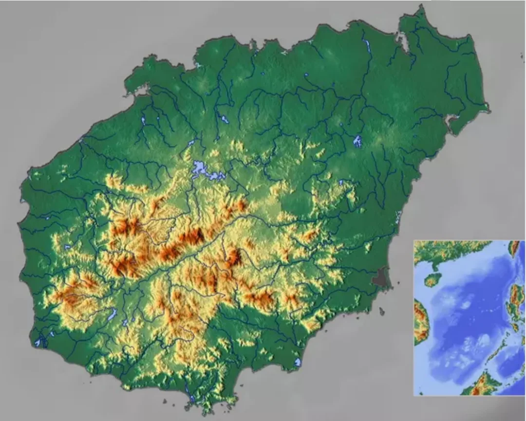🌐海南岛地势中部高,四周低,地貌由山地、丘陵、台地、阶地和平原等地貌类型构成,呈三大环带,由里向外依次分布于全岛。内环位于中南部,由一系列中、低山组成,分别属于五指山、黎母岭和雅加大岭等三列山脉,占全岛总面积的25.6%;中环为中、低山外围的丘陵地貌单元,北部、西部、南部分布面积较大,占全岛总面积的13.5%;外环由台地、阶地和平原等地貌单元构成,是三大环中面积最大的一环,占全岛总面积的60.9%。