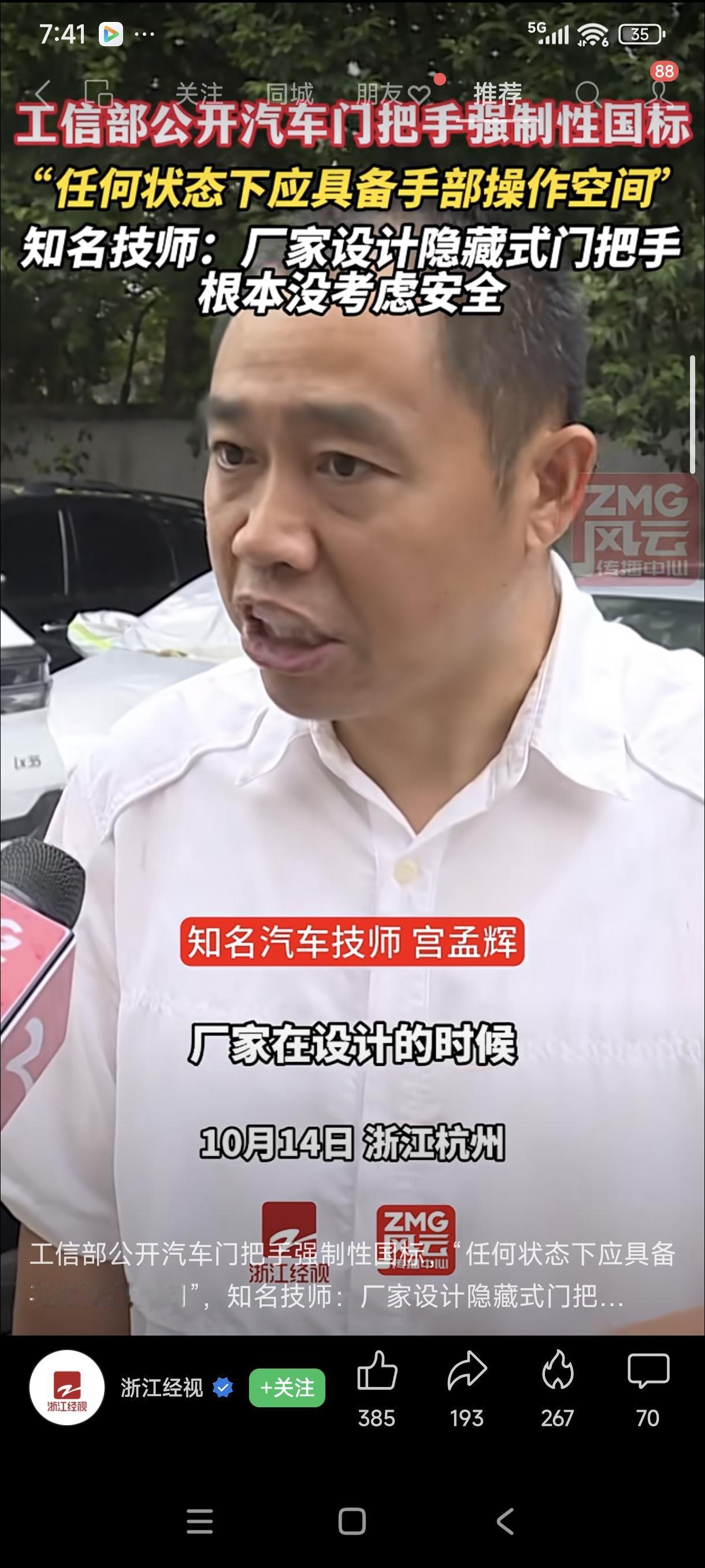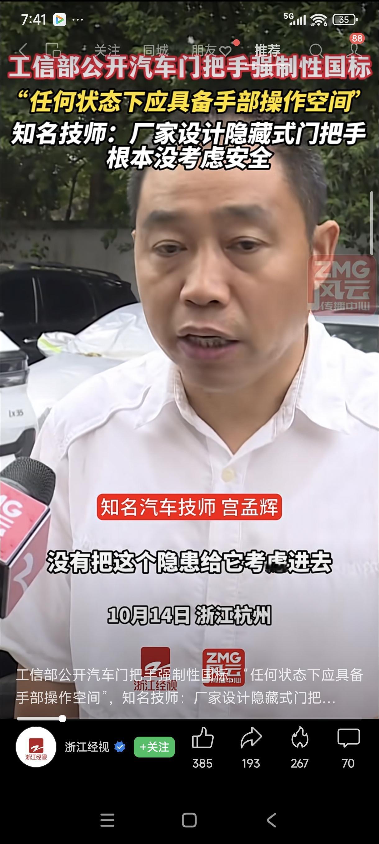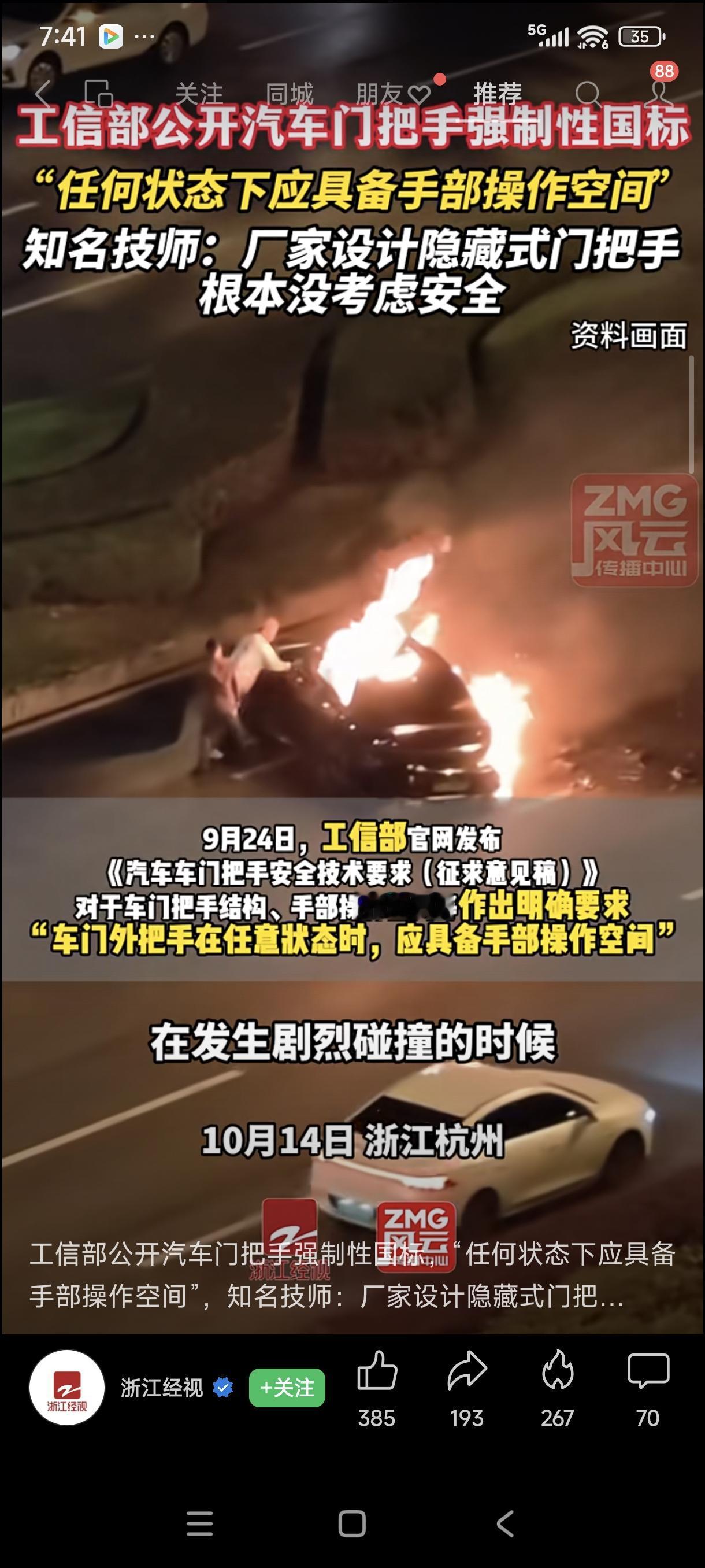 9月24日,工信部官方发布《汽车车门把手安全技术要求(征求意见稿)》,其中对车门把手和手部操作空间等做出了明确要求,“车门外把手在任意状态时,应具备手部操作空间。” 对于隐藏式门把手,知名汽车技术宫孟辉表示,现在好多厂家在设计的时候,就根本没有把车子碰撞后车门打不开的这个隐患考虑进去,设计时应该考虑在发生剧烈碰撞的情况下,车辆应自动断电、断油,自动解开门锁,以方便救援,减少车辆发生自燃的情况。而现在的隐藏式门把手,完全摒弃了安全的初衷,只顾着往省钱、创新和好看方面考虑了。 最近,成都小米汽车碰燃事件,虽然官方给出了通报,但还是引发了大家的质疑。因为,通报中只说了司机涉嫌酒驾,没有说起火原因和车门打不开的原因。而这两个原因,也是大家关注的重点。 第一,国标要求(GB38031-2020),车子发生碰撞后,5分钟是不允许自燃的。第二,车子碰撞后,车门没有严重变形,车门为什么打不开。那几个救援的人,拳打脚踢,把自己的手都干流血了,硬是没打开,后面是消防员切割后才打开的。 大家认为,司机酒驾有法律的制裁,而车子起火和车门打不开,是不是也得给一个说法?隐藏式车门把 汽车门把手 汽车把手