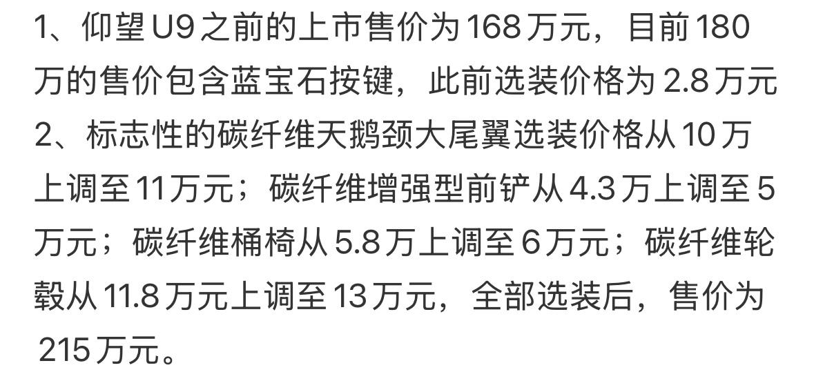 仰望U9售价从168万调至180万 有网友算了一下,这价格包括豪车税,整体比之