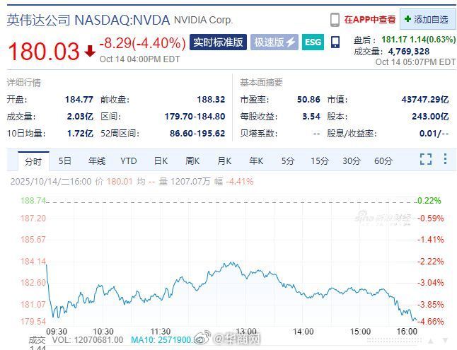 英伟达报180.03美元,跌4.40%,市值一夜蒸发2014亿美元(约合人民币14378亿元)。