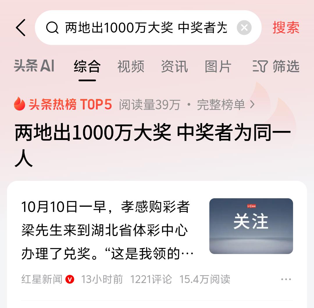 爽剧都不敢这么演,两个地方买彩票同时中了1000万!多大的运气啊。这可不是第一次了,去年就有一个人同时在两个省中奖,购买时间也只差了十几分钟好像,不知道咋操作的。2000万交税20%还有1600万,一下千万富翁,不敢想。买刮刮乐最多也就中过100元[捂脸]