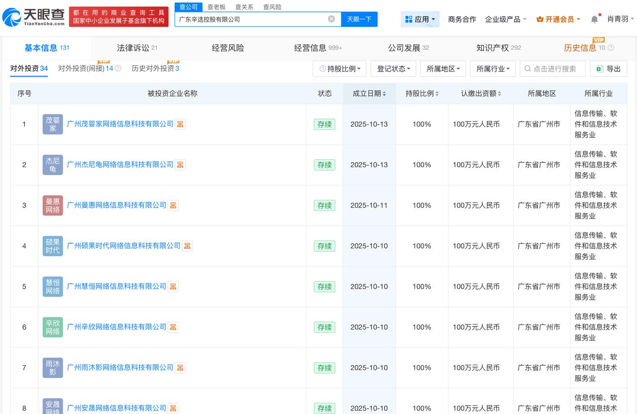 辛巴公司近期成立多家新公司 辛选近日成立8家新公司 天眼查App显示,近日,广州杰尼龟网络信息科技有限公司、广州茂婴家网络信息科技有限公司等成立。值得注意的是,10月10日至10月13日,辛巴(辛有志)实控公司广东辛选控股有限公司已投资成立8家新公司,上述公司法定代表人均为计梦瑶,注册资本均为100万人民币。 天眼查信息: