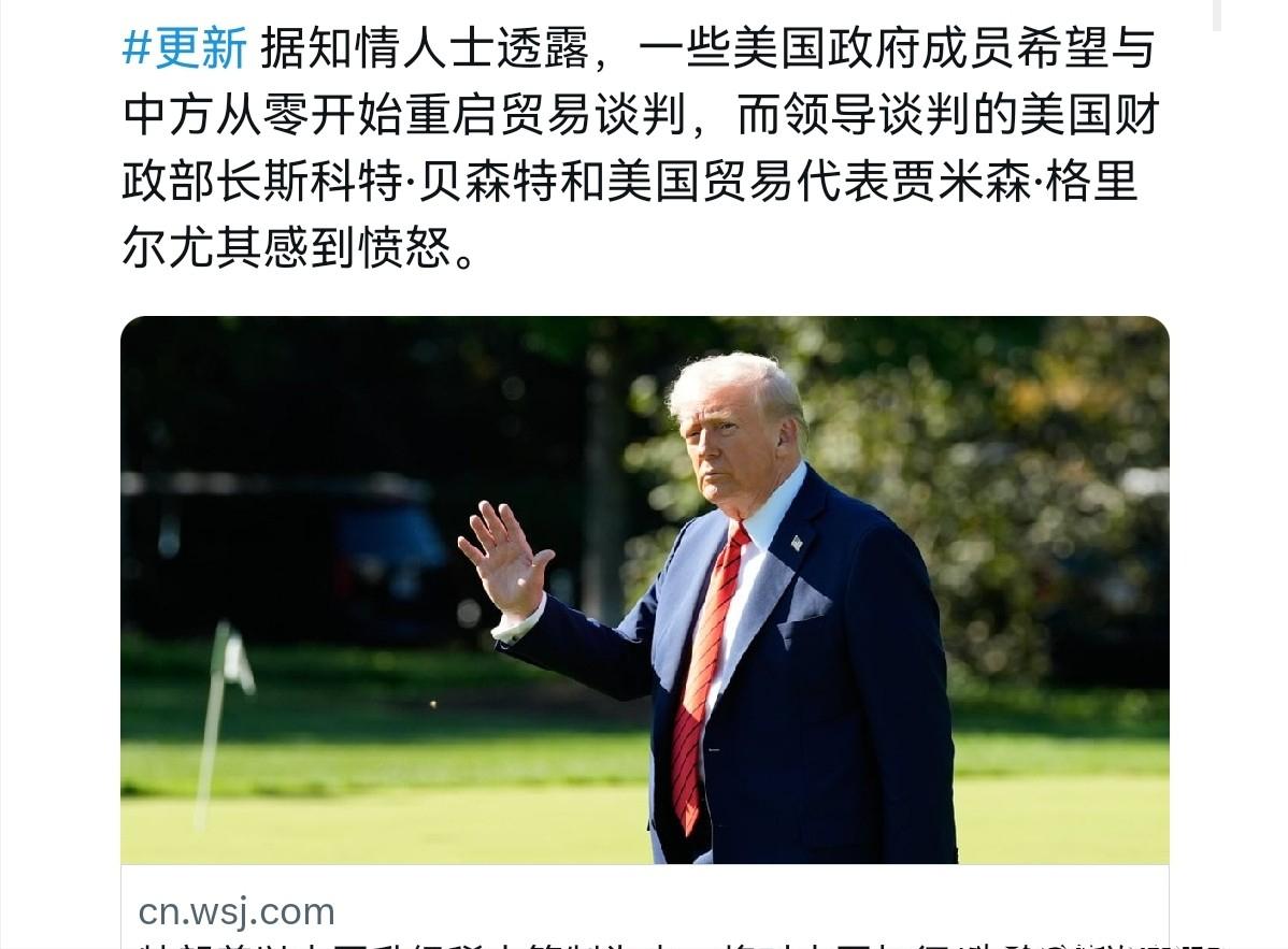 在我们作出反制之后,美国高层就如何跟中国打交道出现了巨大的分歧! 据《华尔街日报》10月14日从知情人士那里得到的消息,面对中国的强力反制,一部分美国政府官员提出,之前跟中国谈好的所有共识都不算数,要彻底推翻重来,重新开启贸易谈判。 这个说法一出来,立刻遭到了负责和中国谈判的核心官员的强烈反对。负责谈判的美国财政部长斯科特·贝森特和美国贸易代表贾米森·格里尔,对“否定现有共识”的提议特别愤怒,他们坚持认为应该基于之前谈好的内容继续和中国沟通。 这两种完全相反的态度,其实暴露了美国政府内部对中美经贸关系该往哪走的深层矛盾。 主张“推倒重来”的官员觉得,中国的反制让美国之前谈下来的成果打了折,只有从零开始才能重新掌握主动权。 但贝森特和格里尔却觉得,这些共识是双方谈了一轮又一轮才达成的,里面涉及到贸易平衡、市场准入等很多领域的利益平衡点,要是全部否定,不光之前花的时间精力都白费了,还可能让中美经贸关系变得更糟,甚至影响到全球产业链、供应链这些更广泛的领域。 其实,类似的这种分歧并不是第一次出现,而是美国政府里“务实派”和“强硬派”在对华政策上长期较劲的体现。 务实派更看重中美经贸合作的稳定,他们清楚中美是全球前两大经济体,2024年两国贸易额就超过6000亿美元,在电子产品、农产品、能源等很多领域都深度绑定,要是政策动得太猛,不光会影响两国企业和消费者,还可能让全球经济跟着波动,所以觉得通过对话解决分歧才符合美国的长远利益。 而强硬派则更倾向于用“极限施压”的激进办法,想逼着中国让步,却没考虑到中国在核心利益问题上不会松口,而且这种做法很可能引发反效果——比如美国企业会因为关税增加成本,农民会失去中国市场,最后受损的还是美国自己。 眼下,这两派的争论还没停下来,美国政府也没拿出统一的办法。但明眼人都能看出来,这种内部分歧直接决定着美国接下来对华经贸政策的方向。 要是“否定现有共识”的声音占了上风,中美贸易谈判就得中断,之前谈成的成果全泡汤,经贸摩擦说不定还会升级;要是能坚持在现有共识基础上接着谈,虽然还是会遇到不少难题,但至少给双方留了通过沟通解决问题的余地。 对于中美两国来说,经贸稳定不光关系到各自的经济发展,还影响着全球的就业和增长。 所以现在大家都在盯着美国政府,看他们能不能尽快把分歧理顺,拿出一个理性务实的对华政策,这不仅是中美两国的期待,也是全球市场的共同关注。