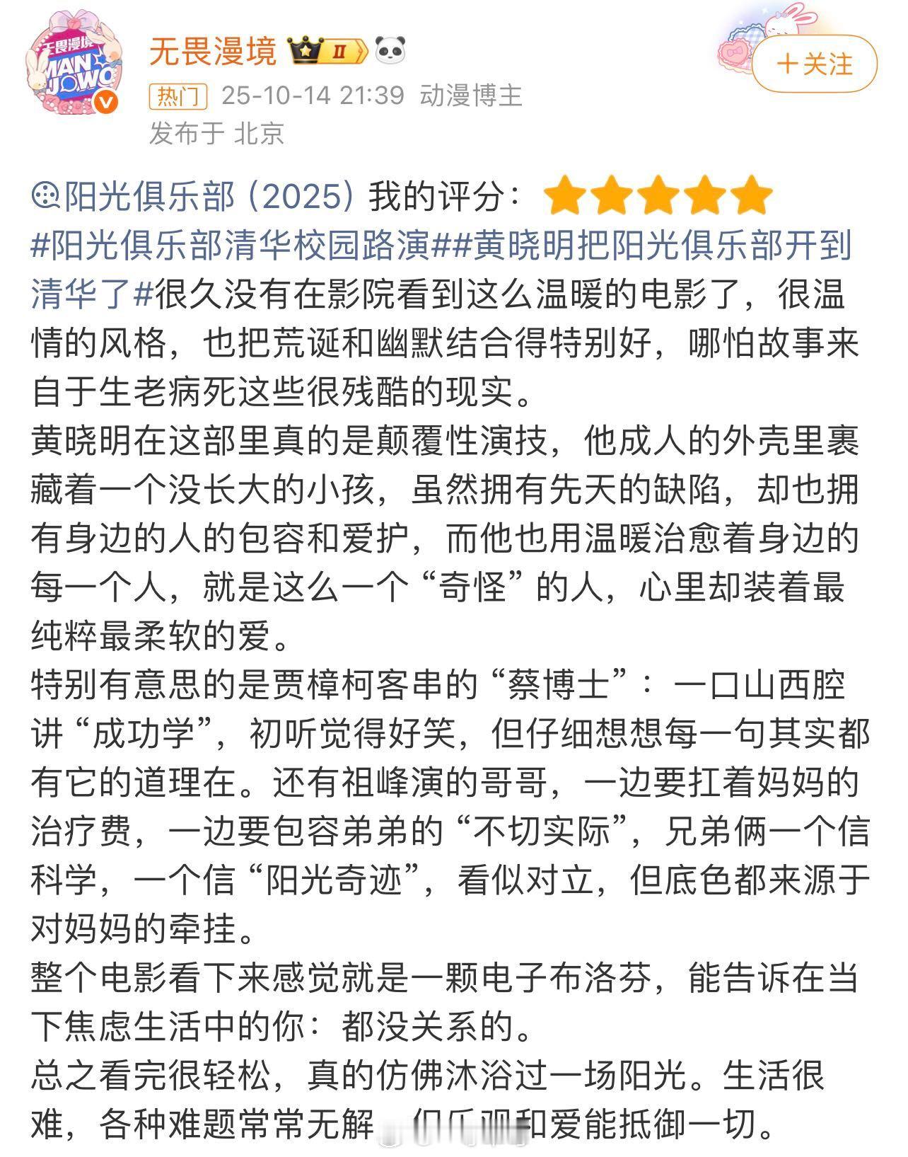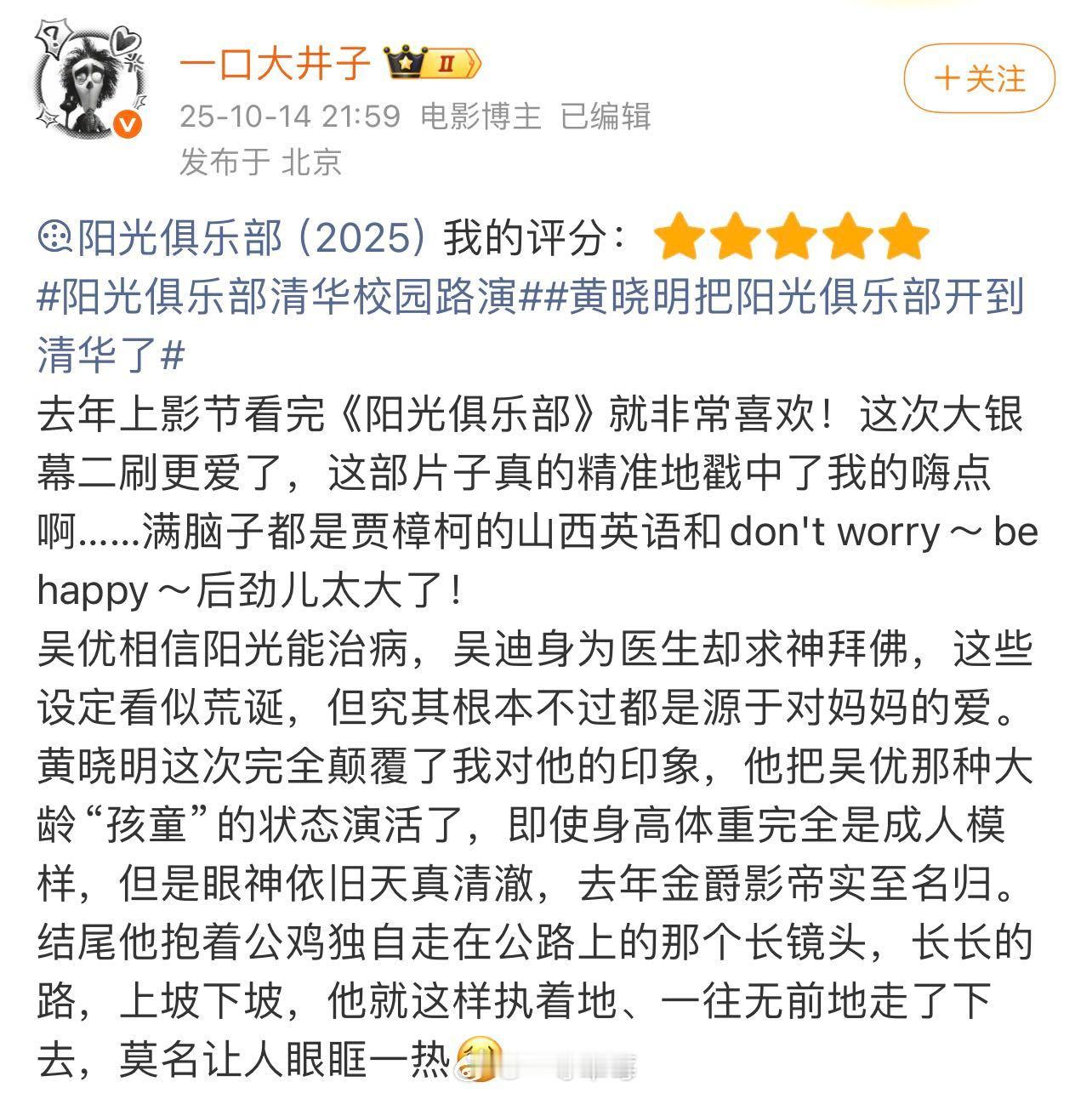 黄晓明新电影《阳光俱乐部》首映影评来了,好评很多呀,都在说差点没认出是黄晓明,真实落地的演技非常打动人,看来很值得看一下。 ​​​