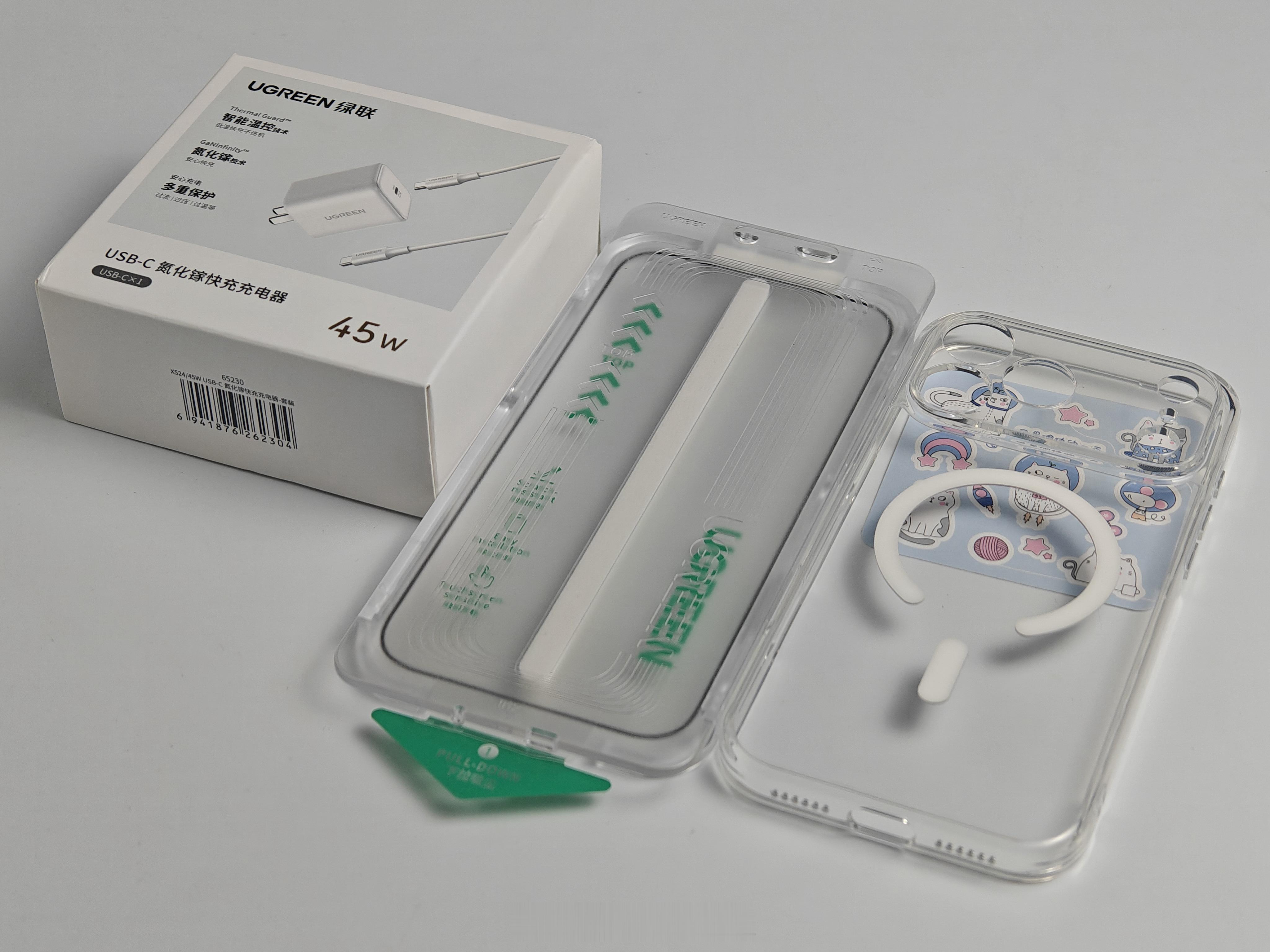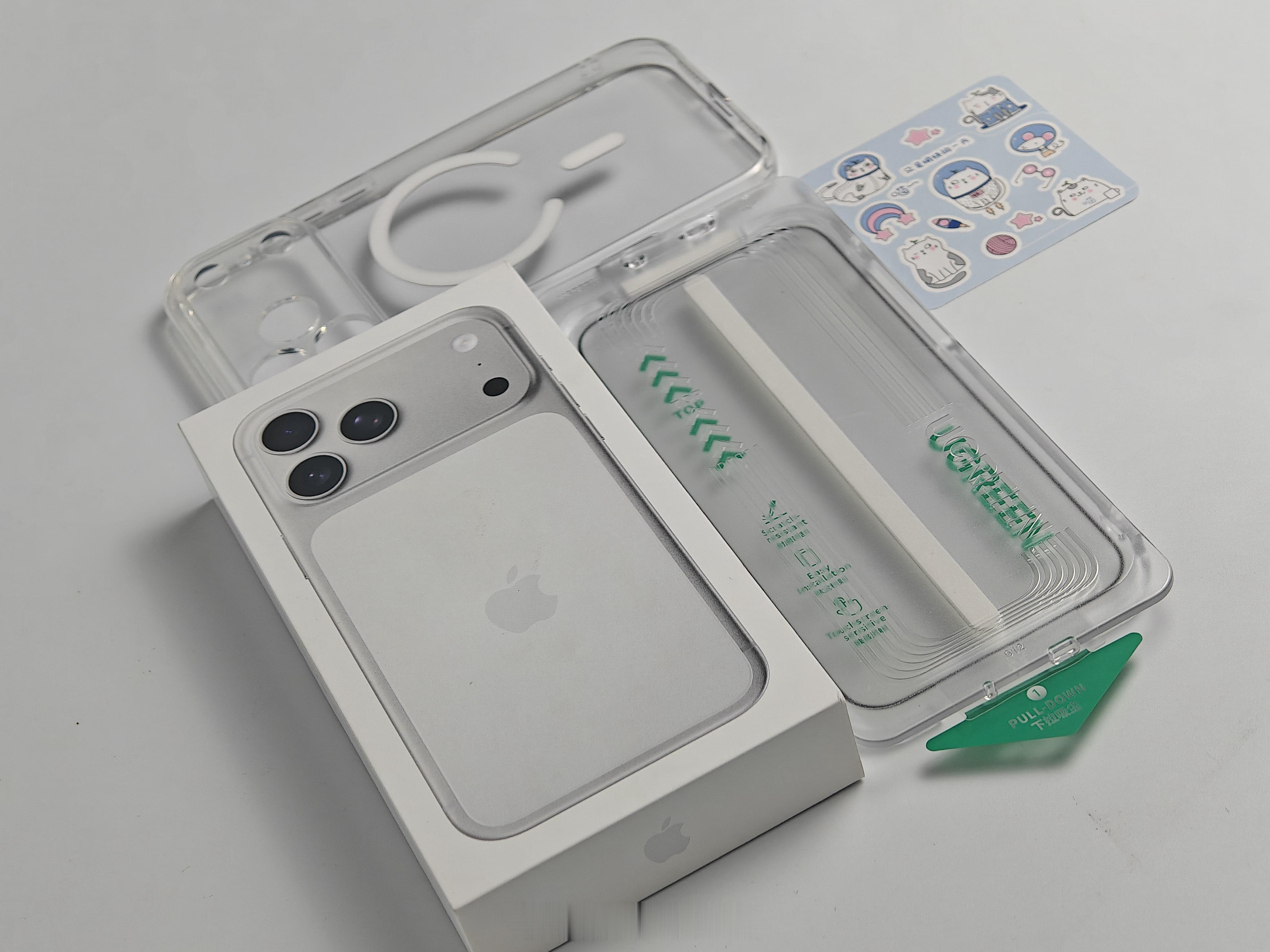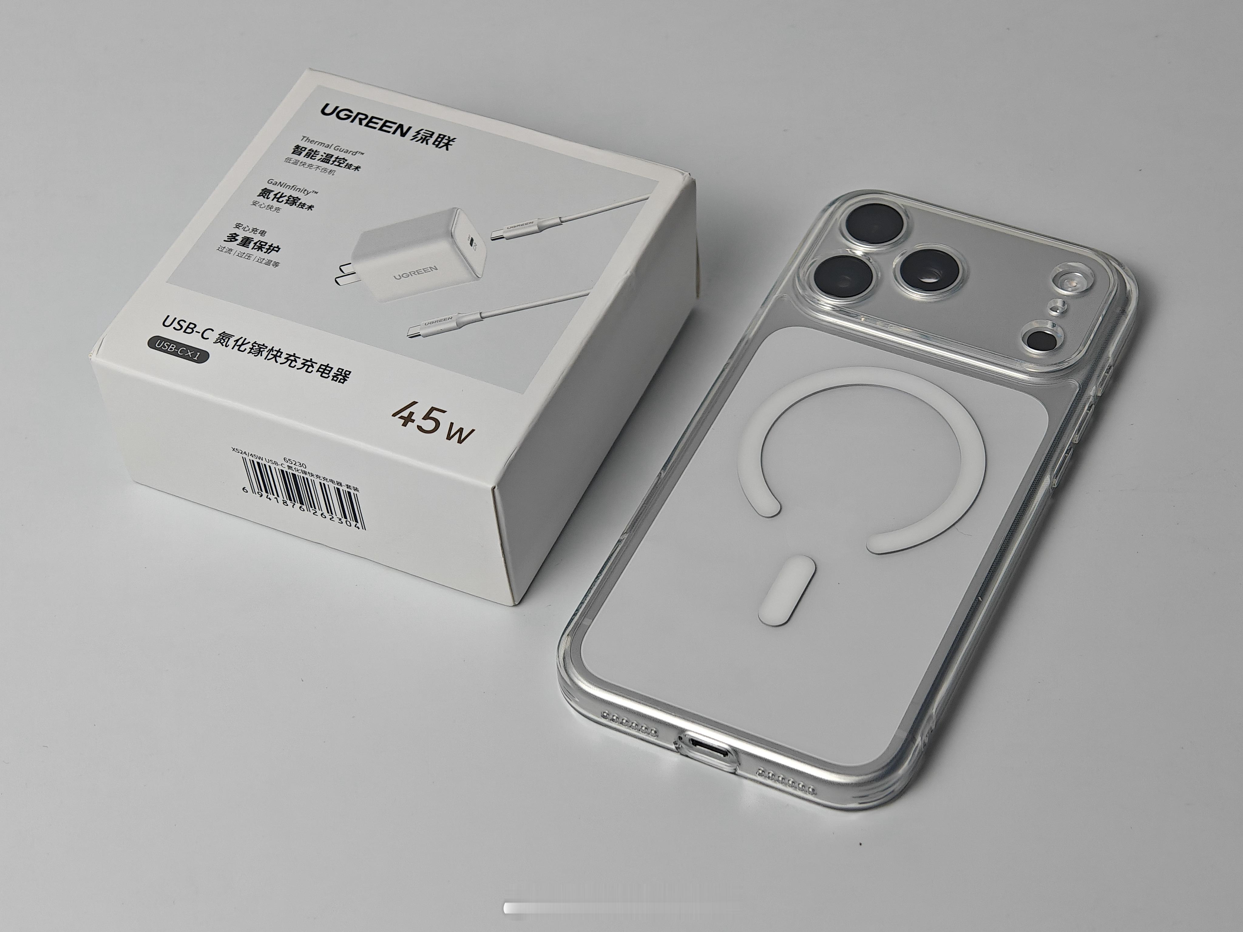 等了那么多天终于抢到了iPhone 17ProMax[并不简单],这不绿联的iPhone 17系列配件也安排上了,绿联AR康宁钢化膜只需把钢化膜往手机上一扣然后轻轻一拉,钢化膜就贴好了,小白也能秒变贴膜大师,还有绿联45W氮化镓快充充电器和绿联磁吸透明手机保护壳,买了新款iPhone 17系列的可以闭眼冲了