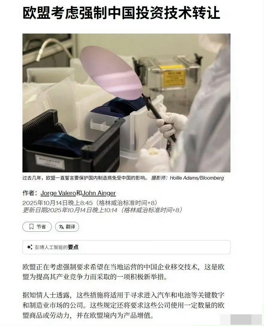 彭博社消息称:欧盟正考虑对中国在欧盟的新投资实施强制技术转让。 欧盟不仅考虑对中国新投资推行强制技术转让,还打算立法要求中资企业交出知识产权,方可进入欧洲市场,重点针对数字技术和先进制造业领域。 有人称中国当年搞合资是自愿行为,是为了让部分行业的外企能以低关税进入(如汽车行业),才选择与之合作,并且也未曾强制要求交出知识产权。 如今欧盟此举,无疑是赤裸裸的抢劫!他们打着“公平竞争”的幌子,行霸权主义之实。这种行径注定会遭人唾弃,更无法阻挡中国企业前进的步伐。
