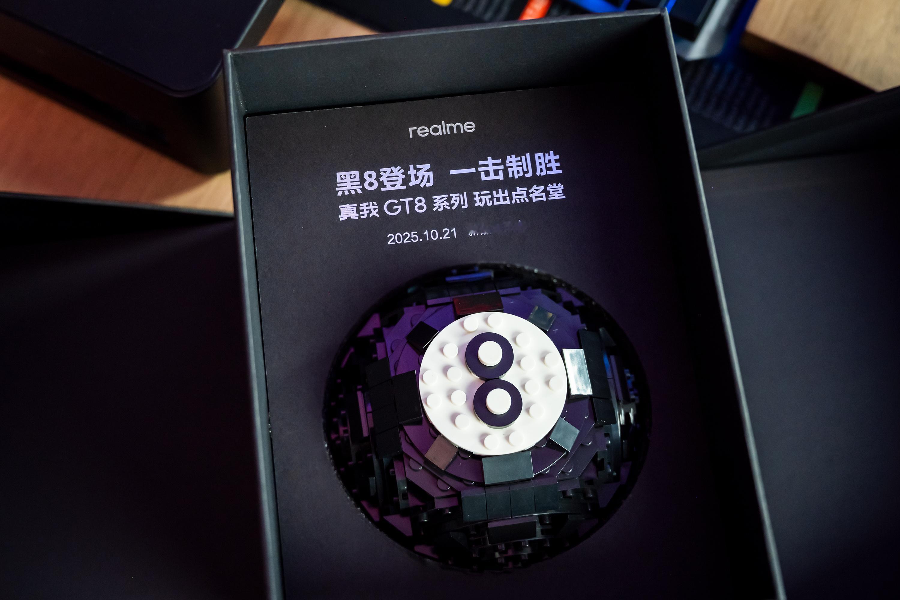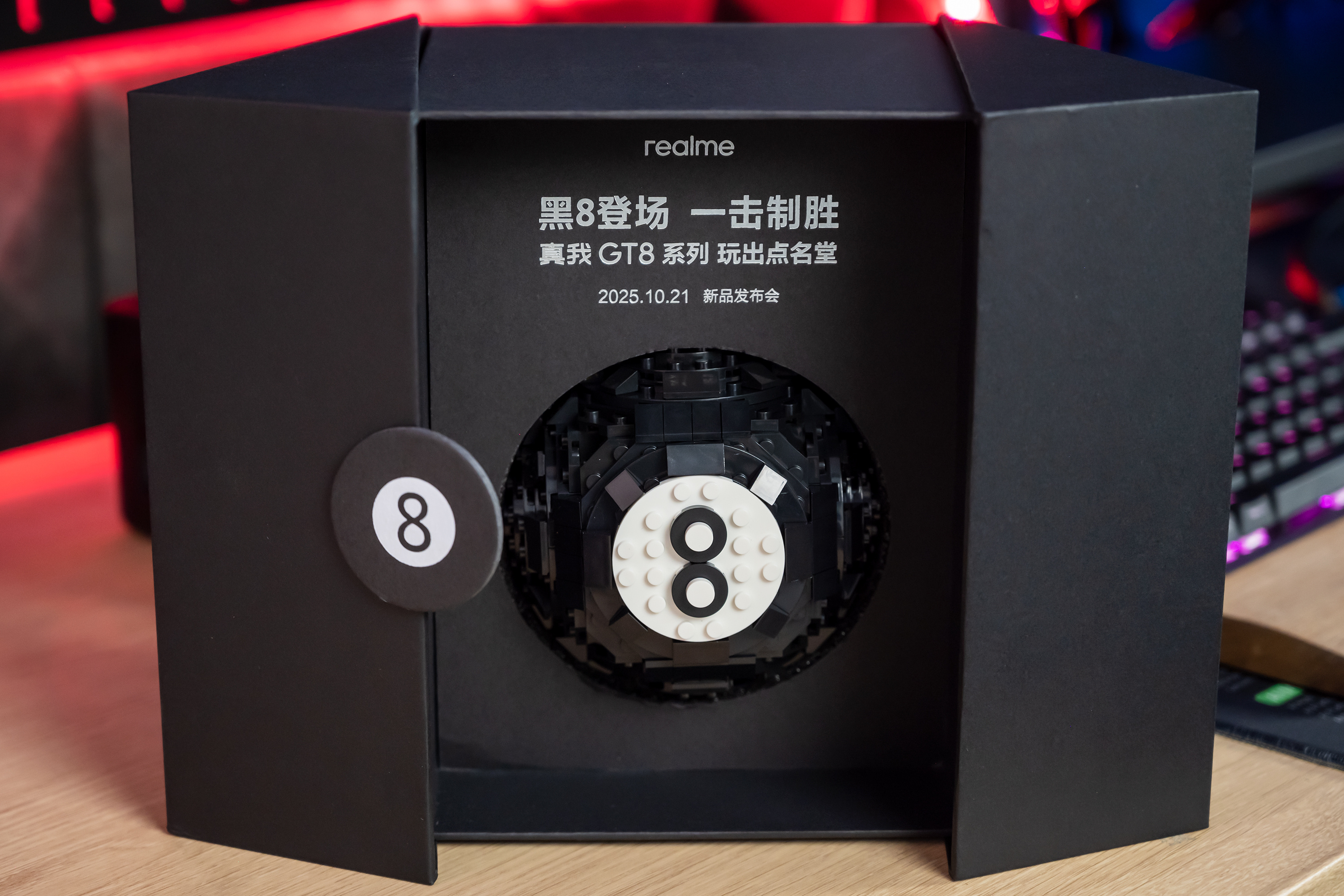 真我GT8系列的邀请函,一个拼装而成的黑8,“黑8登场,一击制胜”。