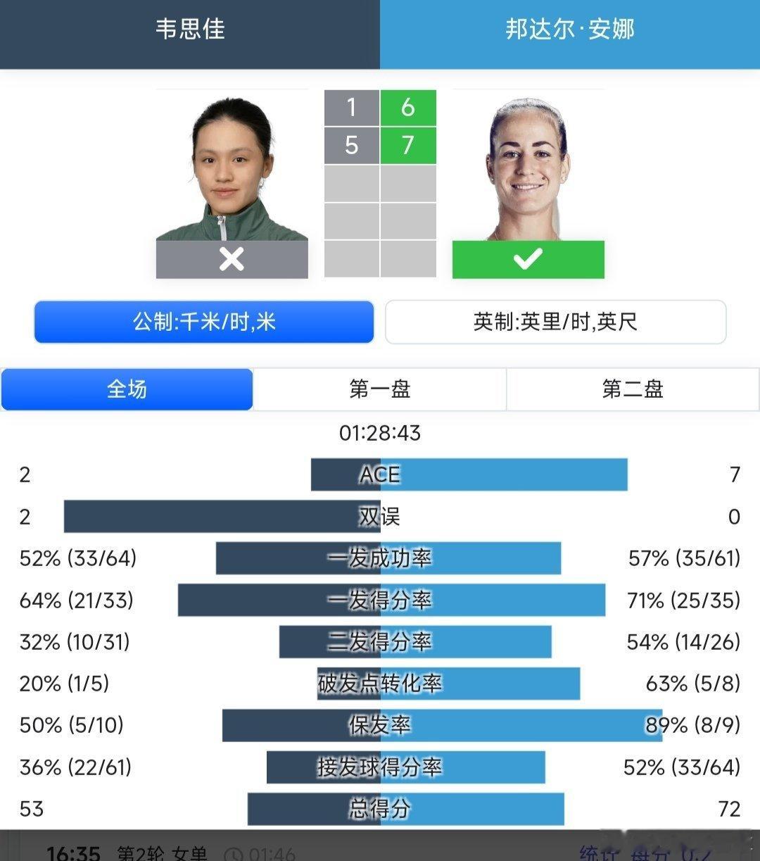 韦思佳🇨🇳1-6/5-7不敌2号种子邦达尔🇭🇺,无缘8强。下一站加油!