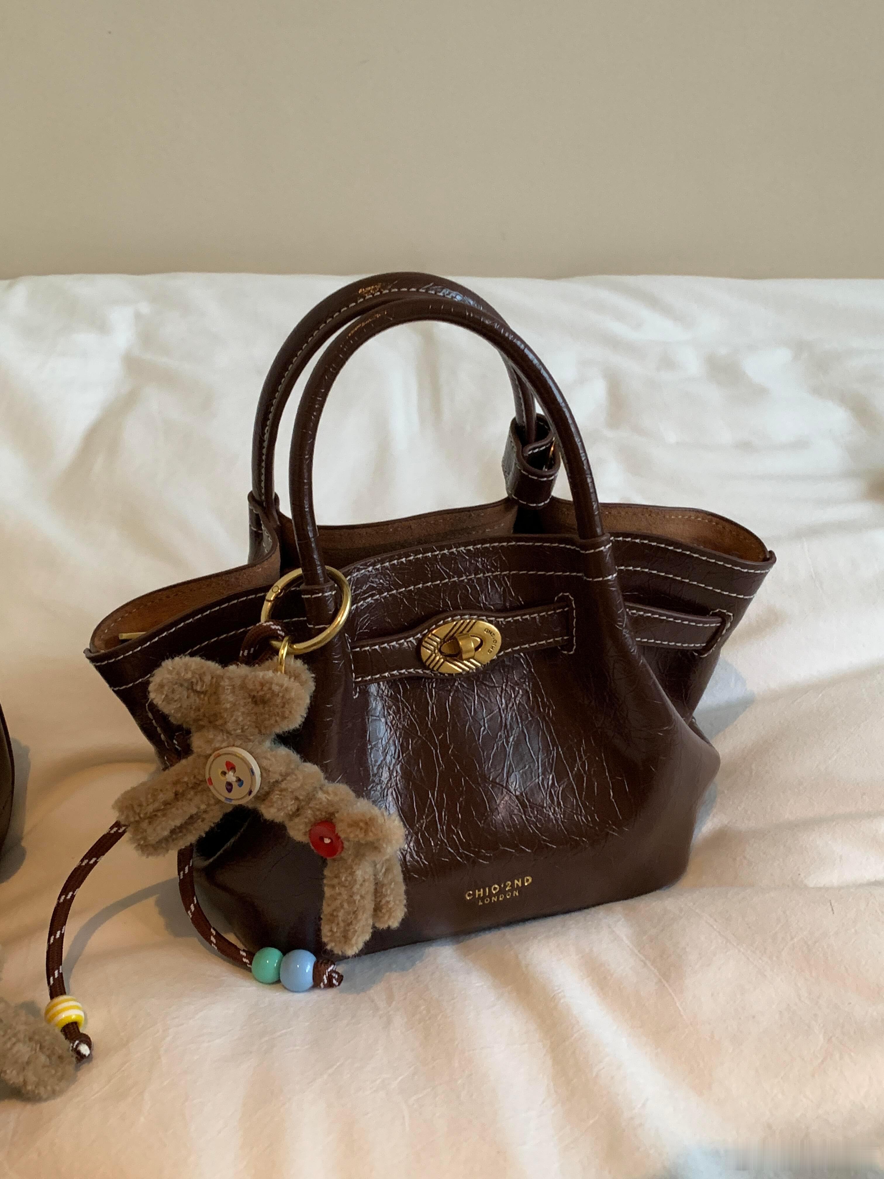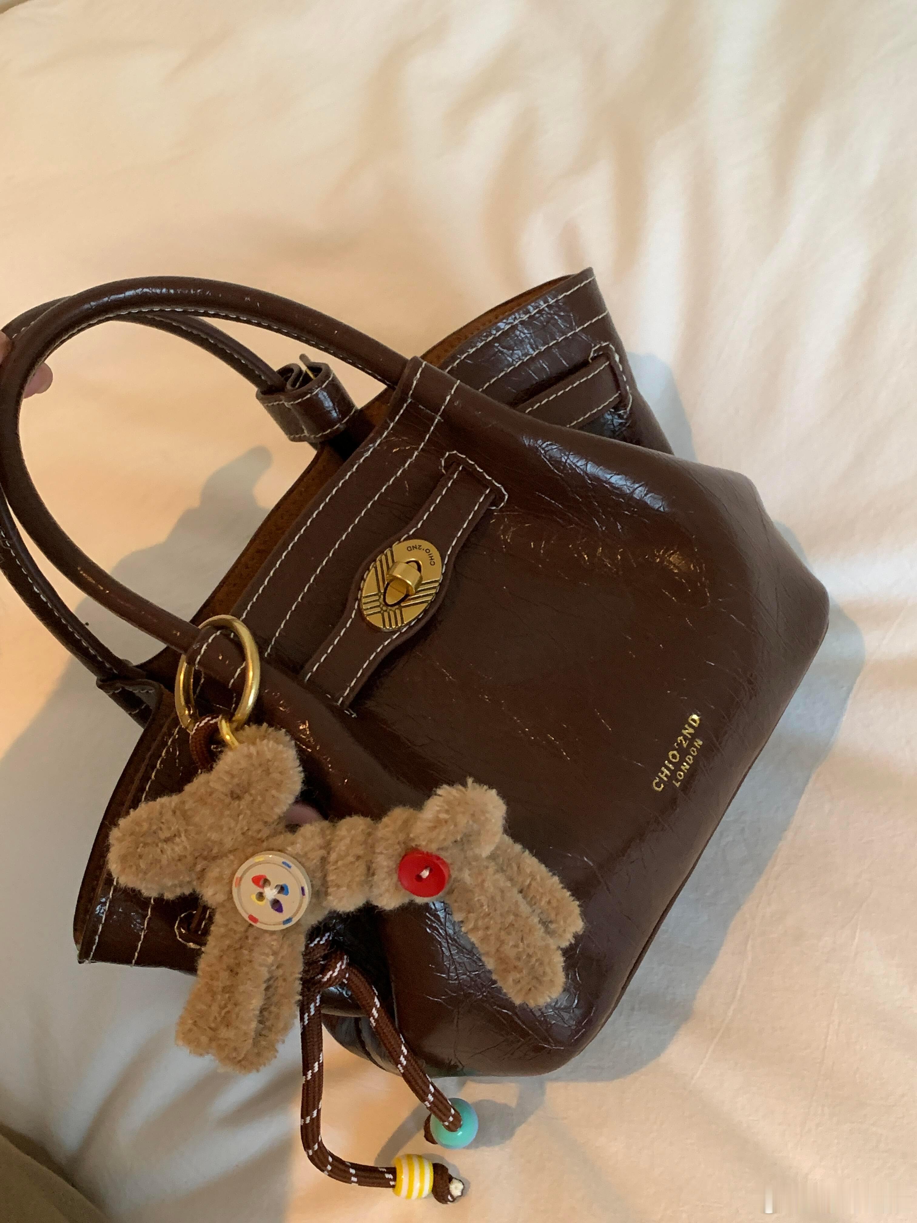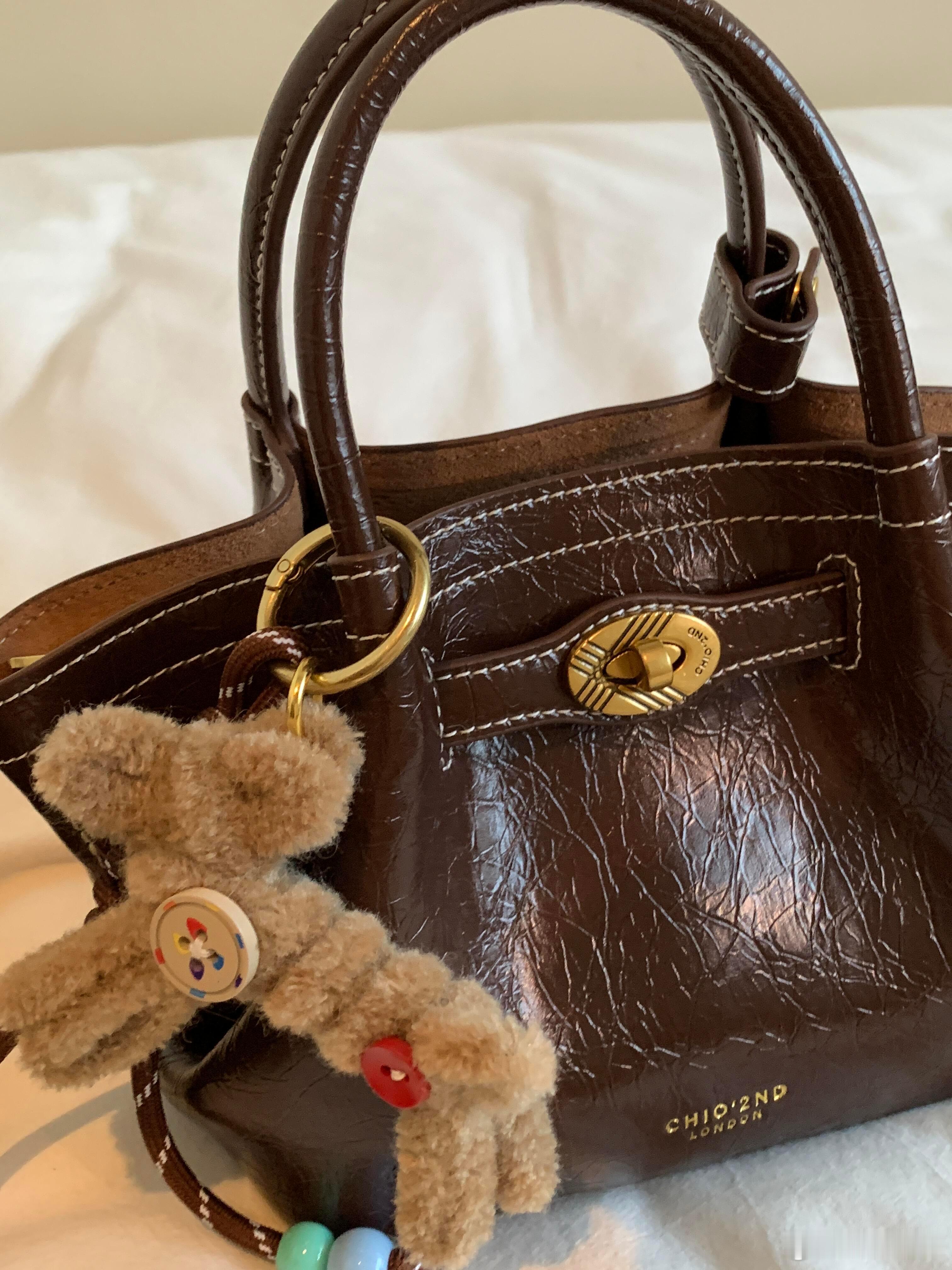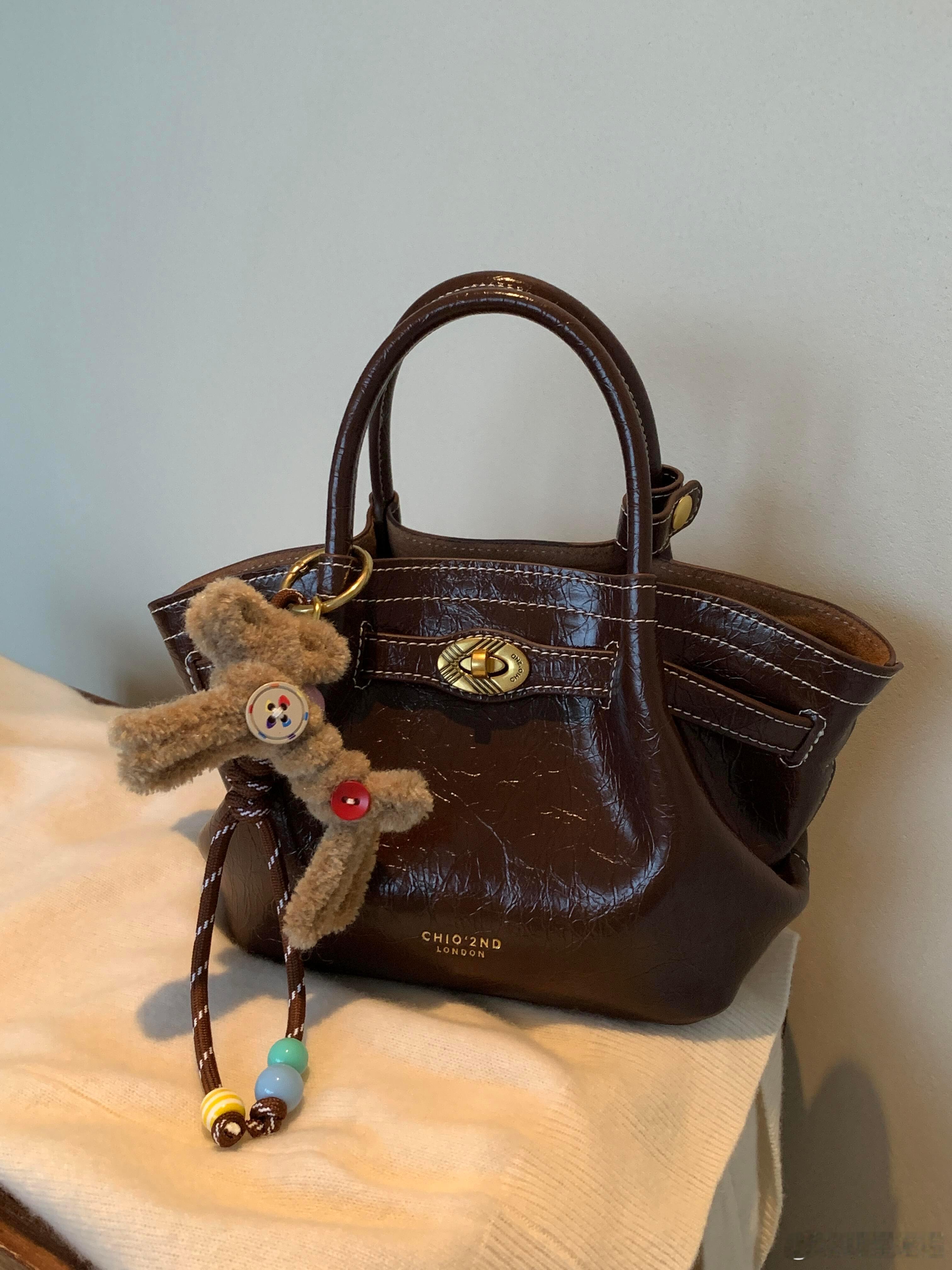 这款深棕色油蜡皮手提包以复古褶皱纹理与白色明线缝制展现粗犷英伦气质,金色“CHLOEZND LONDON”压印标识点缀侧面。包扣悬挂的浅棕色毛绒兔饰成为视觉焦点——彩扣拼贴的衣裳与垂挂的珠链摇曳生姿,与皮革的硬朗质感形成奇妙碰撞。俯拍视角下,“CHAFFEY”“MOMO”“BLOSSOM”等标签如彩蛋般散落包周,仿佛讲述着伦敦街头的童趣故事。整体既保留传统皮具的精致工艺,又通过萌宠挂饰注入灵动活力,完美平衡成熟质感与俏皮美学。时尚配饰