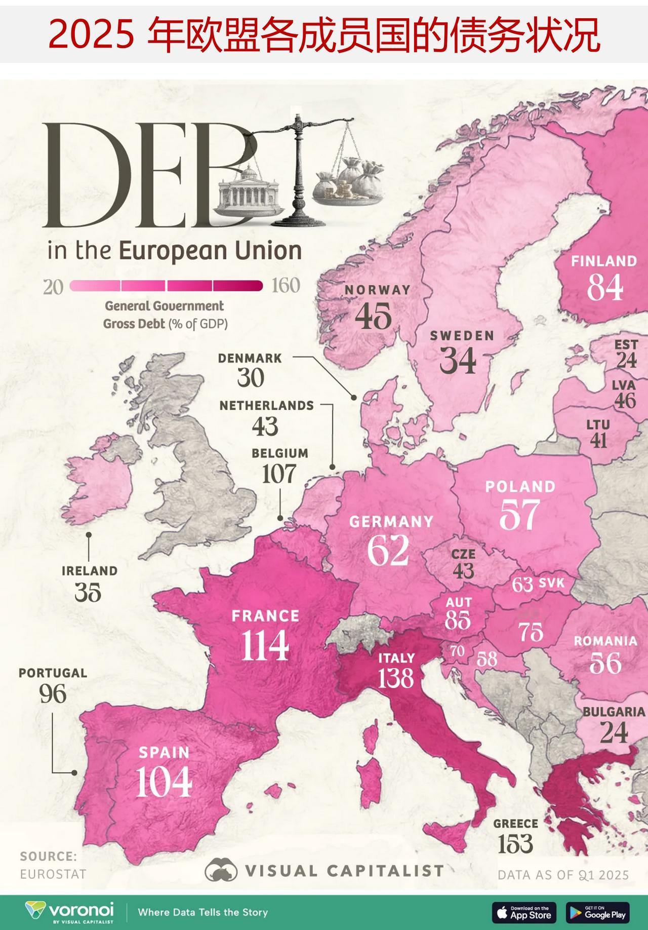 2025 年欧盟各成员国的债务与国内生产总值之比 随着欧洲各国将数十亿资金投入到国防开支中,其债务总额也在不断增加——这引发了有关国家财政稳定性的质疑。 在法国,不断上升的债务比率导致惠誉在 9 月下调了该国的信用评级。该国正持续遭受政治动荡,其债务供应量近期已达到创纪录的 4 万亿美元。 这张图表展示了展示了截至 2025 年第一季度,欧盟各国政府的总债务占国内生产总值的百分比情况,数据来源于欧盟统计局。 尽管到 2025 年,希腊的经济因旅游业、房地产和航运业的繁荣而蓬勃发展,但其债务状况仍为欧盟中最为糟糕的。 然而,该国的债务与国内生产总值的比率近年来持续下降,从 2022 年的 180%降至如今的 153%。鉴于其近期的经济势头,该国与贝莱德集团合作设立了创新与基础设施基金,旨在吸引 12 亿美元的外资投入。 意大利的债务与国内生产总值的比率在欧盟中位居第二高位,为 138%。然而,该国在缩减赤字方面取得了显著进展,从 2023 年占国内生产总值的 7.2%降至 2024 年的 3.4%,这得益于强劲的税收收入。与希腊一样,其债务水平也一直在逐渐下降。 相比之下,法国的债务水平正在上升,其债务占国内生产总值的比例已达 114%。为了应对日益恶化的财政状况,法国政府提高了退休年龄,并提议取消两个法定假日——此举引发了公众的强烈不满。 与此同时,德国的债务比率仅为 62%,显著低于欧盟 82%的平均水平。然而,该国却通过大幅增加国防开支来放宽财政规则,从而导致债务水平上升。