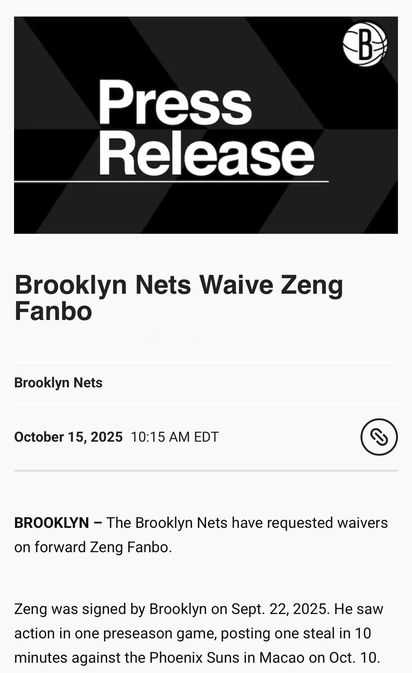 布鲁克林篮网官方宣布裁掉曾凡博。