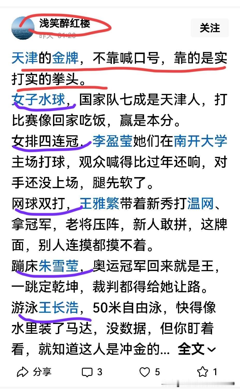 [玫瑰][玫瑰]第十五届全运会竞技体育项目有几百个,天津体育有为数不多的几个夺金点(见截图一): 1,女子水球:粉吹国家队中有七成是天津人,打比赛像回家吃饭,赢是本分。 回:先打赢上海、广西、湖南等女子水球队,再吹也不迟。 2,成人女排:粉说是板上钉钉,非津莫属。 回:先打赢江苏、上海、山东等女排再吹不迟。 3,蹦床:粉说朱俊莹奥运冠军回来就是王,一跳定乾坤,裁判都得给她让路。 回:全运会蹦床比赛结束,蹦床四枚金牌,分别被山西(2金)、江苏(1金)、湖南(1金)夺得。天津蹦床无人问金。 4,男子游泳50米自由泳:粉吹王长浩快的像水里装了马达,没数据,你盯着看,就知道这人是冲金的…….瞧这吹的,可笑至极。 回:天津王长浩在今年全国游泳冠军赛,全国游泳锦标赛都没进决赛,全运会有无正赛资格都是问题,问一下潘展乐、孙佳俊,徐放等,看他们答不答应! 5,女子网球双打:粉说这块金牌,别人连摸都摸不着。 回:先问一下湖北、广东等女双,看答不答应! 6,还有吗?津粉不妨都晒出来,让大家看看。 凡事有度,过犹不及。还未赛就先吹上了。这说明:一是心虚没底,二是浮夸浮躁不稳重,三是八字还没一撇呢,就井蛙语海,给人以好吹牛的感觉,这种习性着实要不得,得改!否则,必被打脸! 再说了,山外有山,天外有天。自诩为“运动之都”,仅有屈指可数的几个没把握的夺金点,有什么好吹的?不觉得很尴尬吗? 第十五届全国运动会