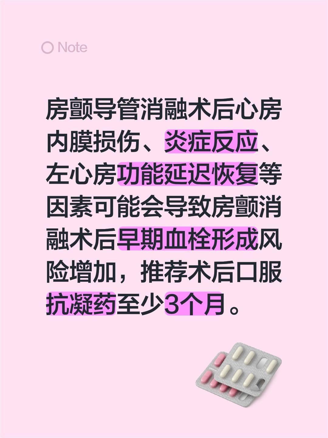 房颤导管消融术后心房内膜损伤、炎症反应、左心房功能延迟恢复等因素可能会导致房颤消融术后早期血栓形成风险增加,推荐术后口服抗凝药至少3个月。